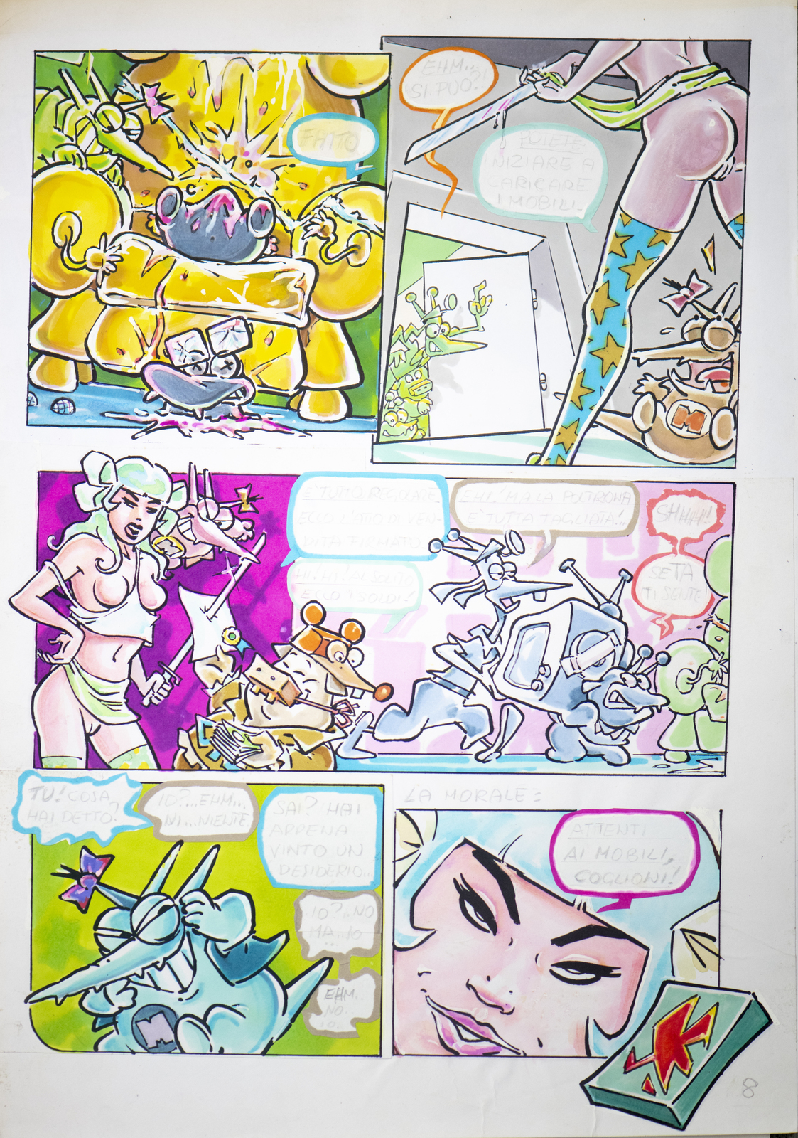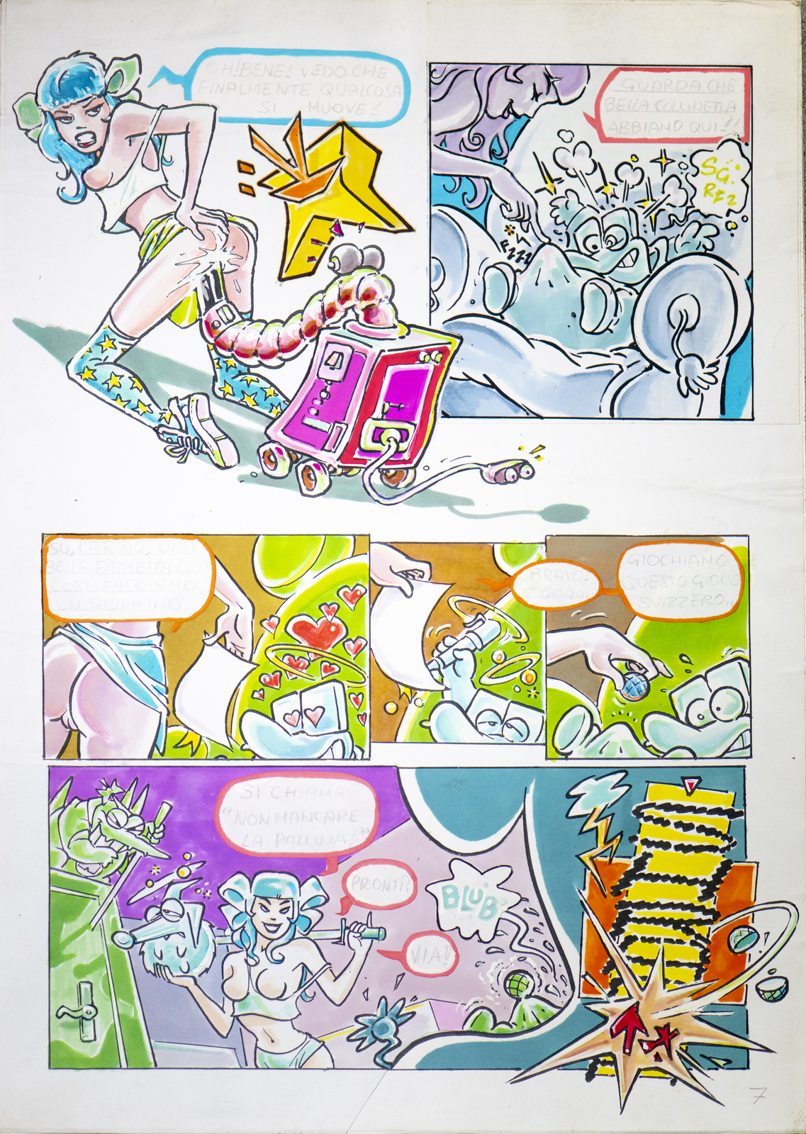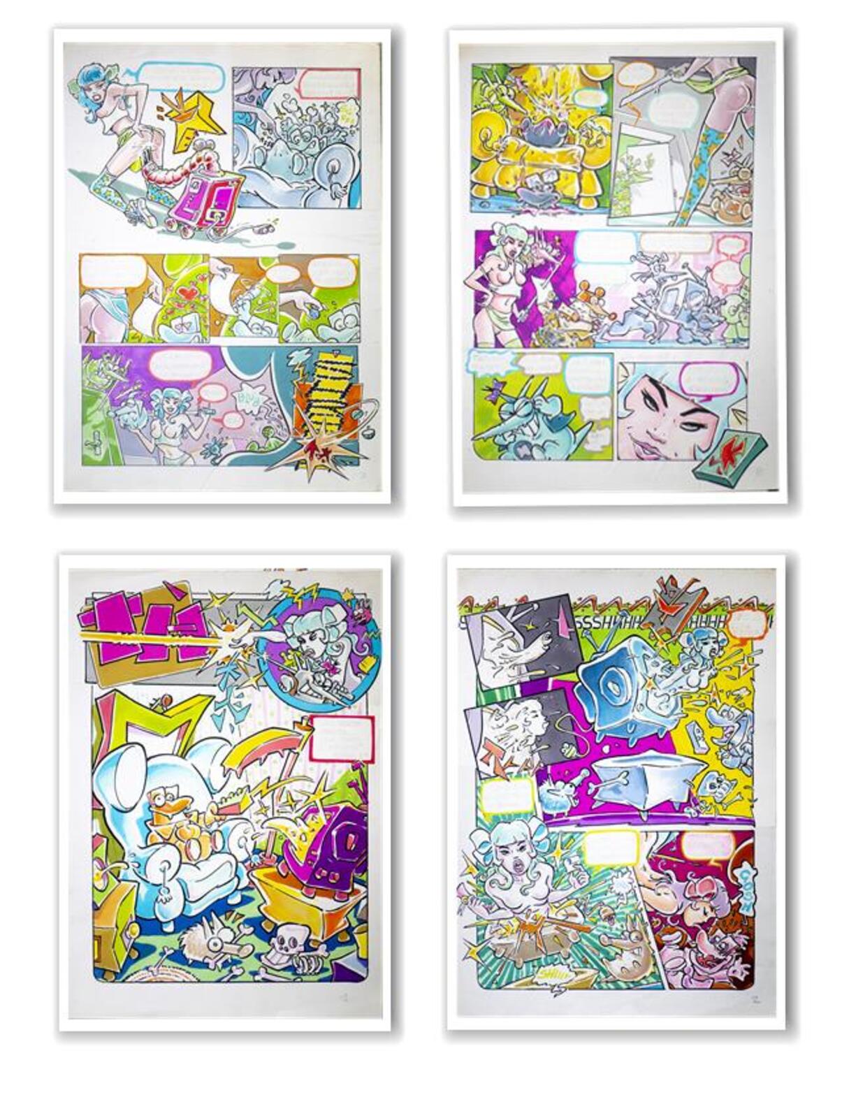 CLAUDIO PANARESE PAP BHAN "CLAUDINE TOSHIKU". stamponi colorati, pennarello, ecoline. Cm 30,00 x 42,00. Pittore, disegnatore, pittore, monaco dal 2010 nel monastero buddista Plum Village in Francia, nella Dordogna. Già disegnatore e sceneggiatore per la Disney ne la serie L'economia di Zio Paperone dal 1992. Qui presentiamo un episodio completo del personaggio di Claudine Toshiku in 4 grandi tavole colorate direttamente.