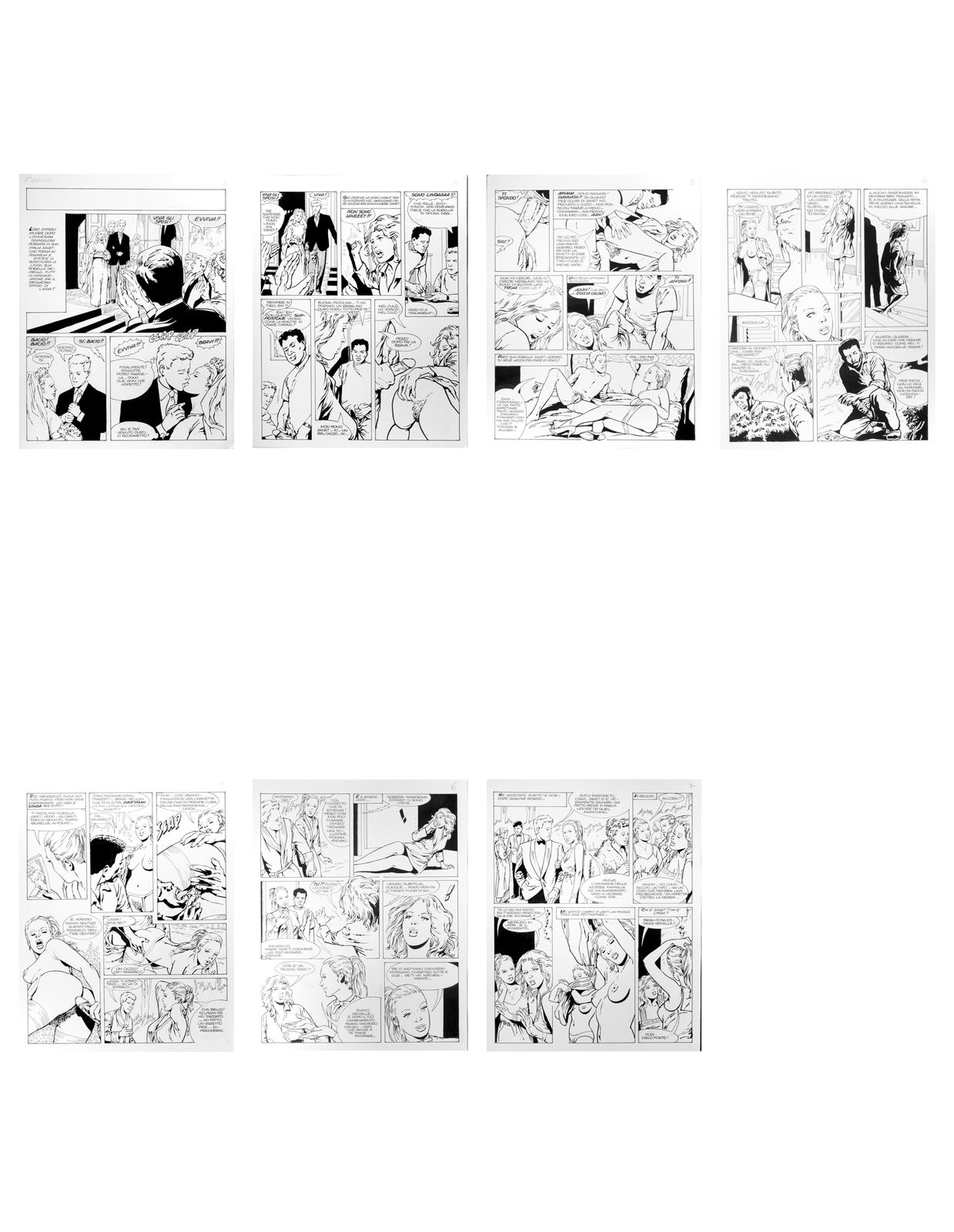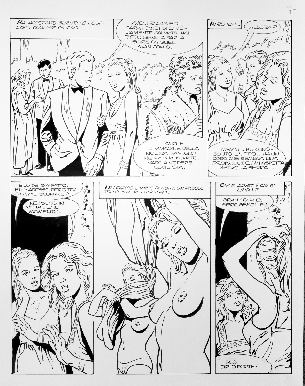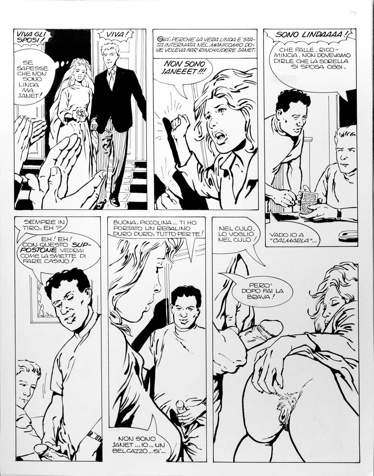 Bernasconi Luciano "Sorelle" - capitolo 7 integrale - Hard Comic album n.2, giugno 1990, Blue Press”. 1990. china e grafite, bianchetto su cartoncino. Cm 30,00 x 40,00. Il capitolo 7 integrale, composto da 8 tavole, delle scorribande sessuali delle scatenate ed invereconde sorelline inglesi Linda e Janet, disegnate da Luciano Bernasconi sotto lo pseudonimo di Saint Germain sui testi di Massimo Vincenti alias Victor Sting.