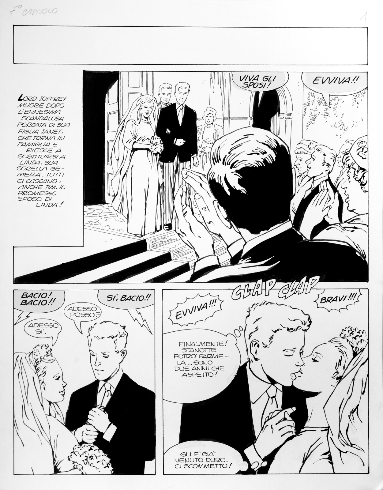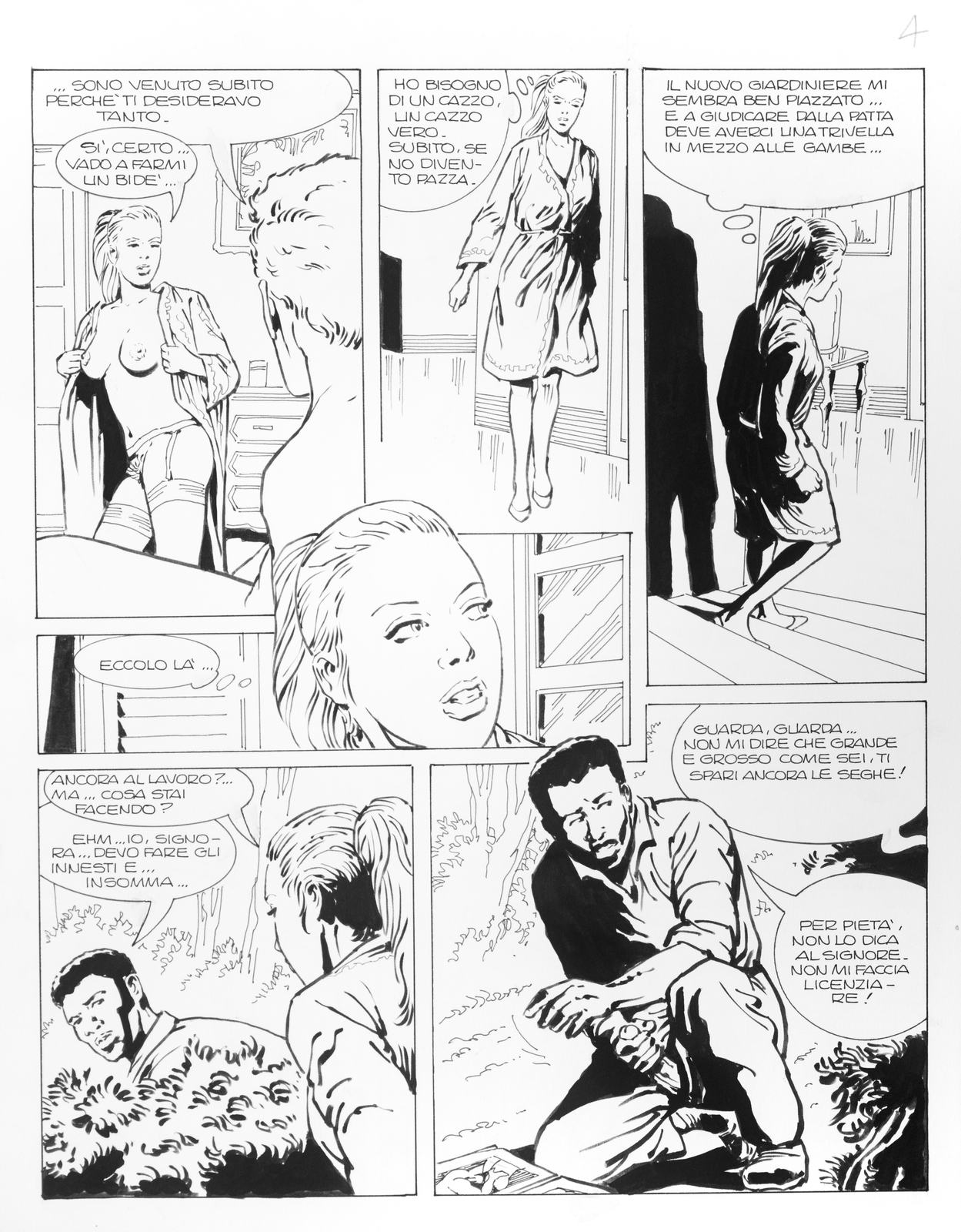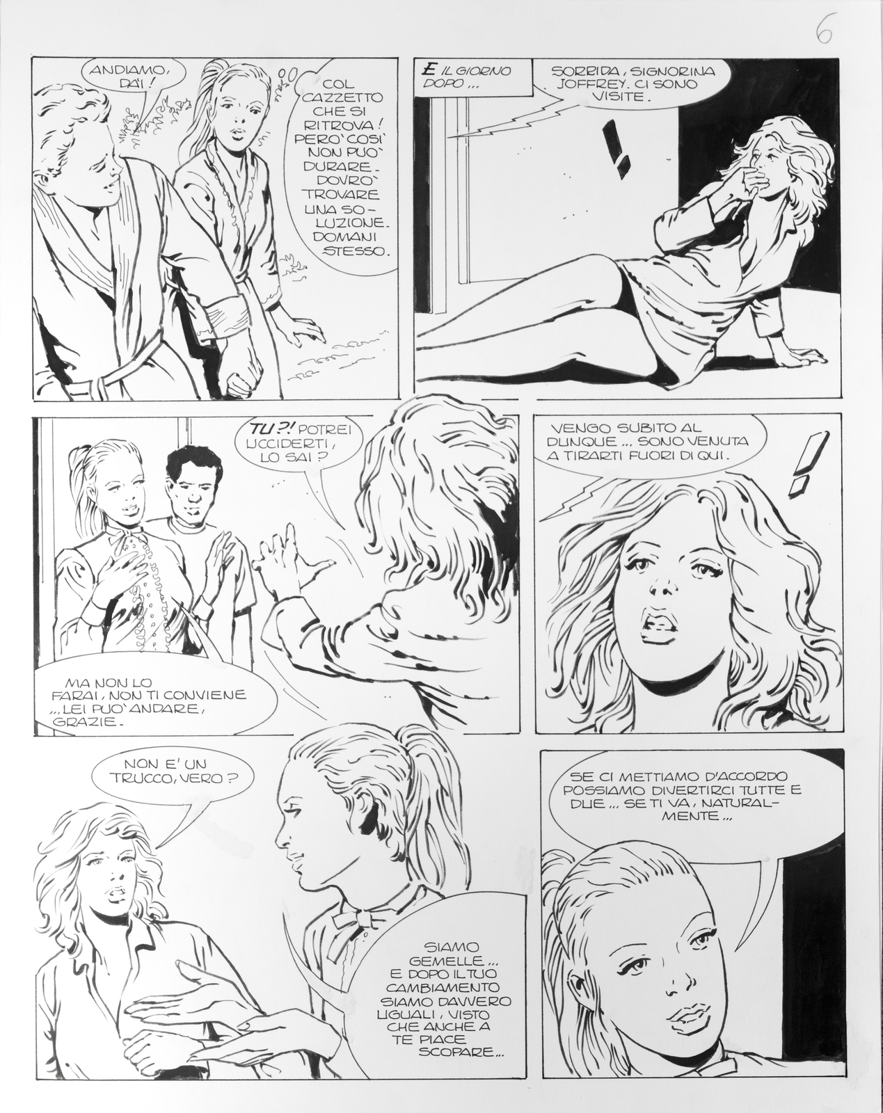 Bernasconi Luciano "Sorelle" - capitolo 7 integrale - Hard Comic album n.2, giugno 1990, Blue Press”. 1990. china e grafite, bianchetto su cartoncino. Cm 30,00 x 40,00. Il capitolo 7 integrale, composto da 8 tavole, delle scorribande sessuali delle scatenate ed invereconde sorelline inglesi Linda e Janet, disegnate da Luciano Bernasconi sotto lo pseudonimo di Saint Germain sui testi di Massimo Vincenti alias Victor Sting.