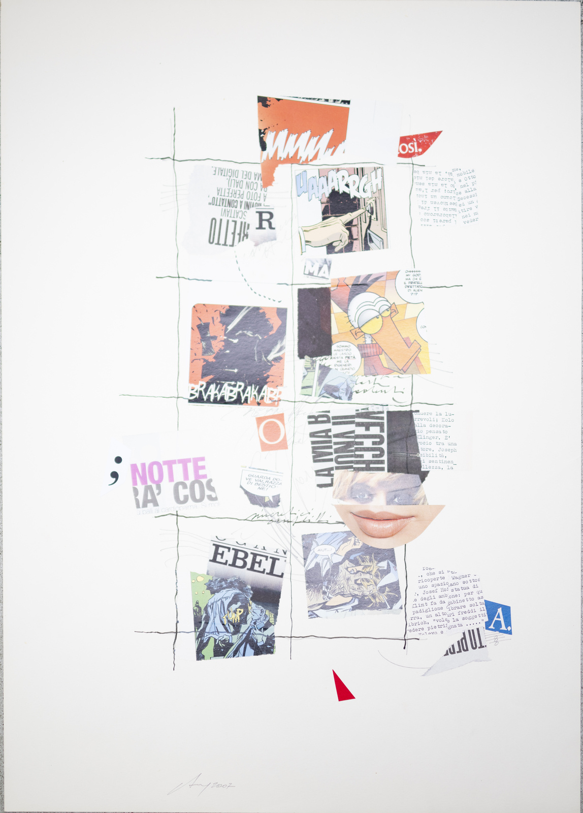 FONTANA GIOVANNI (n. 1946) ENIGMA 2VISUAL POEM. 2007. collage di fogli di calendario su carta. Cm 50,00 x 70,00. Partiture visive, musica per gli occhi, scritte per essere guardate dove ritrovi sempre il pentagramma, magari nascosto ma lo rivedi. Una dimensione figurale che poi si sposa con la dimensione grafica della scrittura che poi ridiventa suono ed è il suono del fumetto.