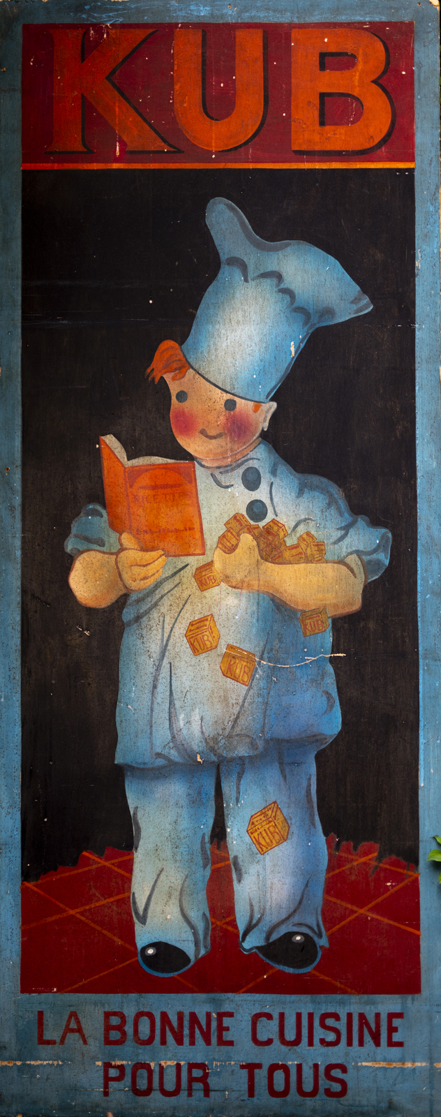 AUTORE NON IDENTIFICATO Boillon Cub/La bon cousione pour tous. tempera su compensato. Cm 100,00 x 180,00. Rarissima Opera anni 20 con il celebre personaggio dello sguattero che presenta una scatola di brodi Kub e con l'altra mano consulta un libro di ricette. Siamo nella Parigi dei primi del secolo, il regno dell'affiche pubblicitaria e della sublime arte di Leonetto Cappiello. Un simbolo il Kub che entrerà anche nelle vicende della Seconda Guerra mondiale ....L'opera risente dei segni del tempo e sicuramente necessita di un restauro conservativo.