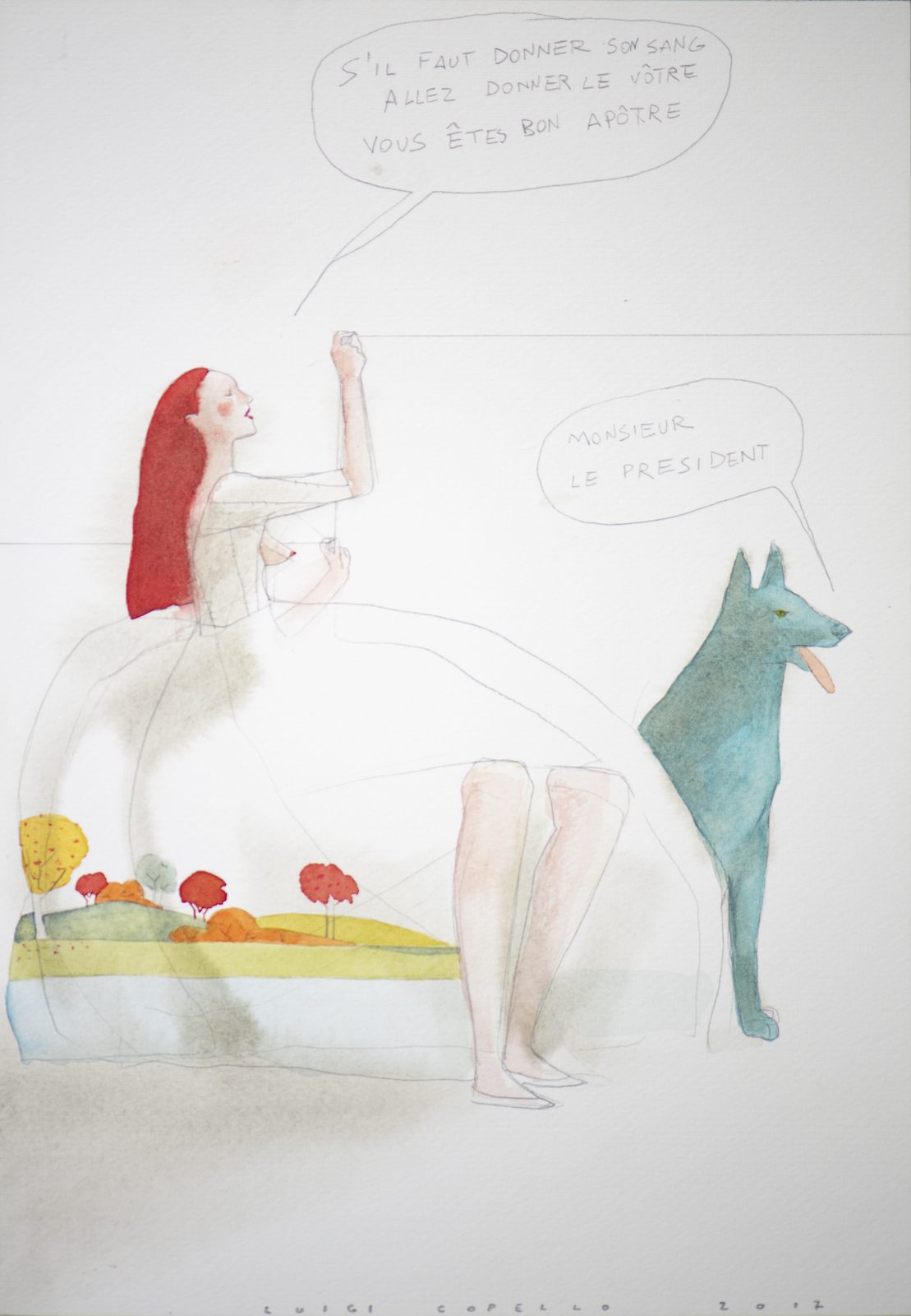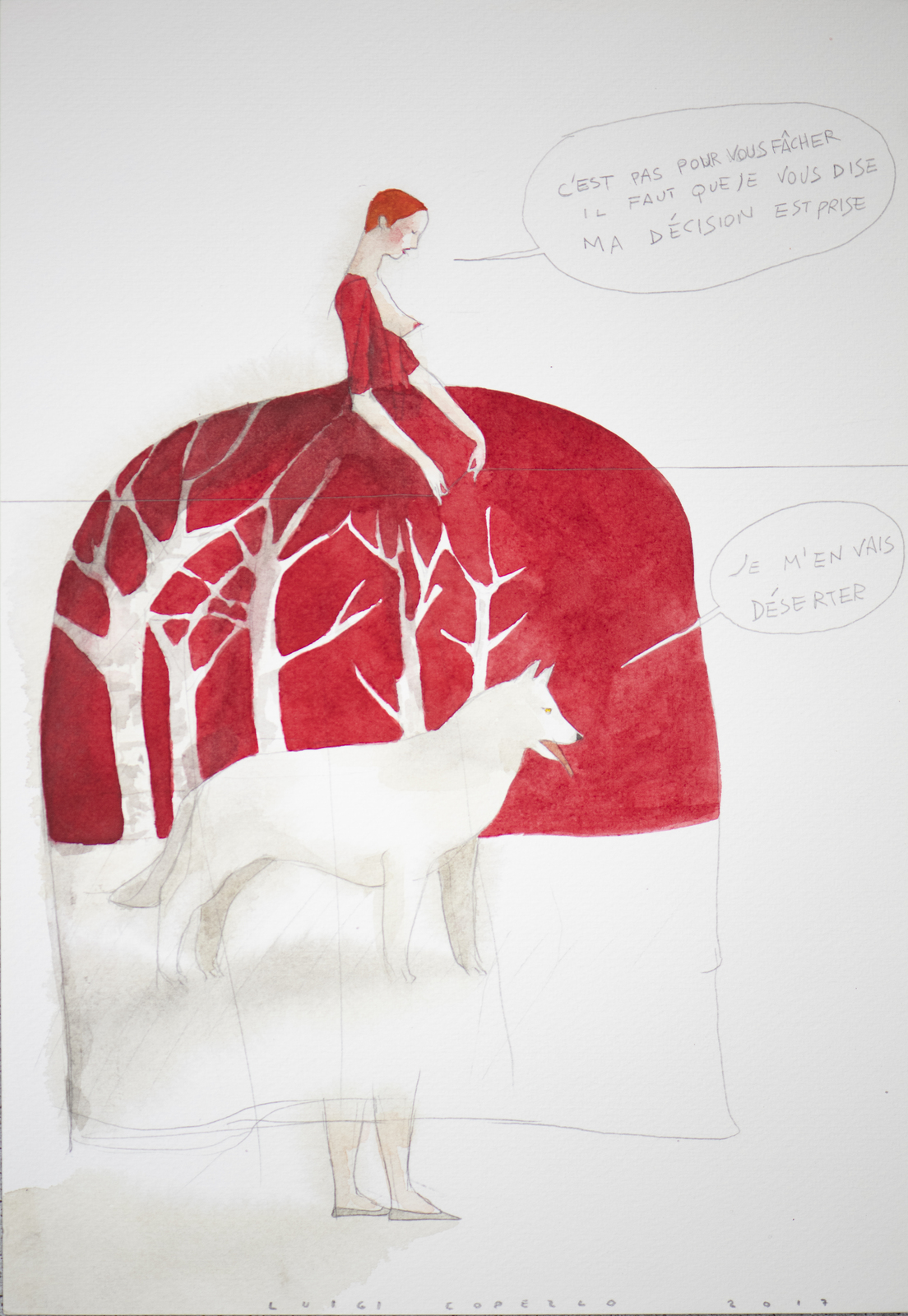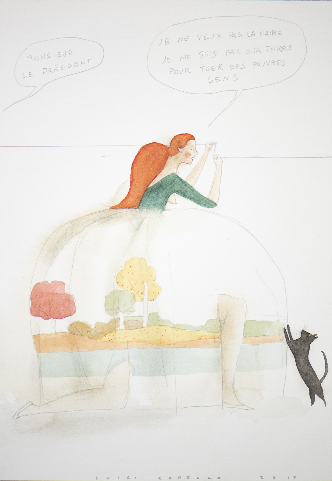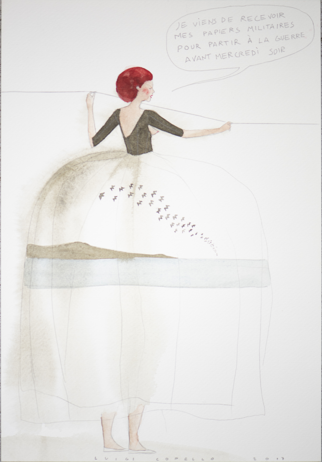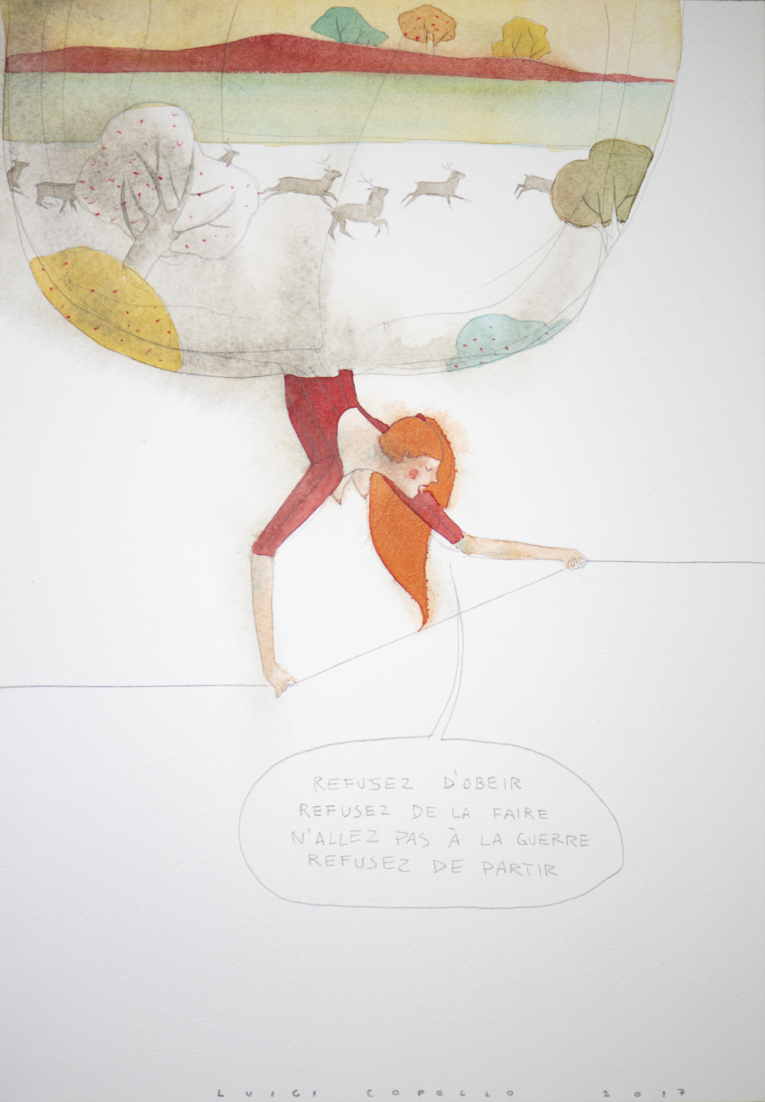 Copello Luigi "Le Deserteur" opera completa che narra, illustra e racconta il celebre brano di Boris Vian del 1954. Acquerello su carta. Cm 36,00 x 25,00. Opera composta da 12 tavole consequenziali realizzate per illustrare in modo onirico, poetico, originalissimo la celebre canzone di Boris Vian, Le Deserteur, opera leggendaria della grande canzone francese d'autore e di protesta, scritta da Boris Vian nel 1954 e pubblicata nell'esecuzione di Marcel Mouloudji il 27 maggio di quello stesso anno, giorno della disfatta della Francia nella Battaglia di Dien Bien Phu, che segna la fine della guerra d'Indocina.