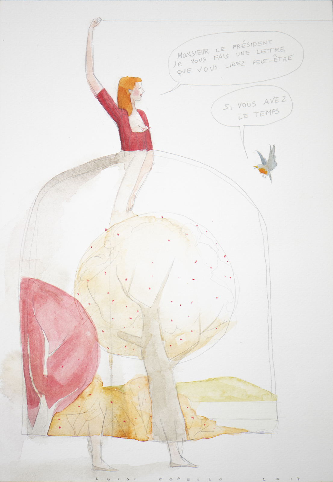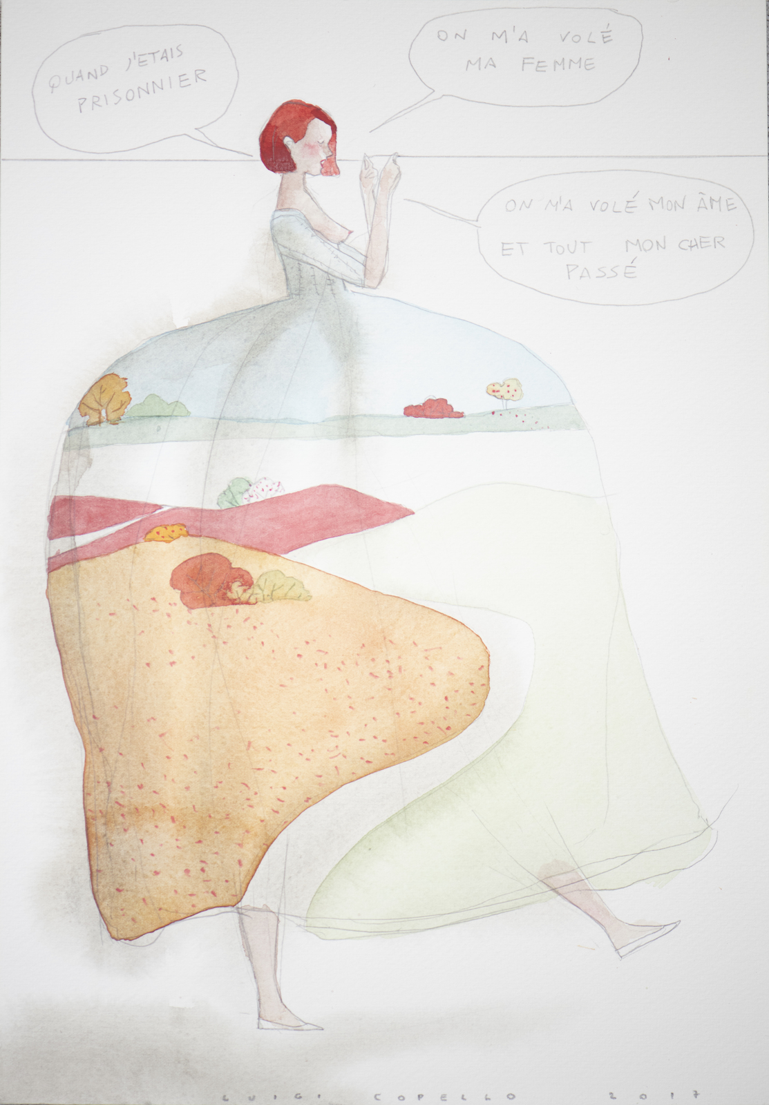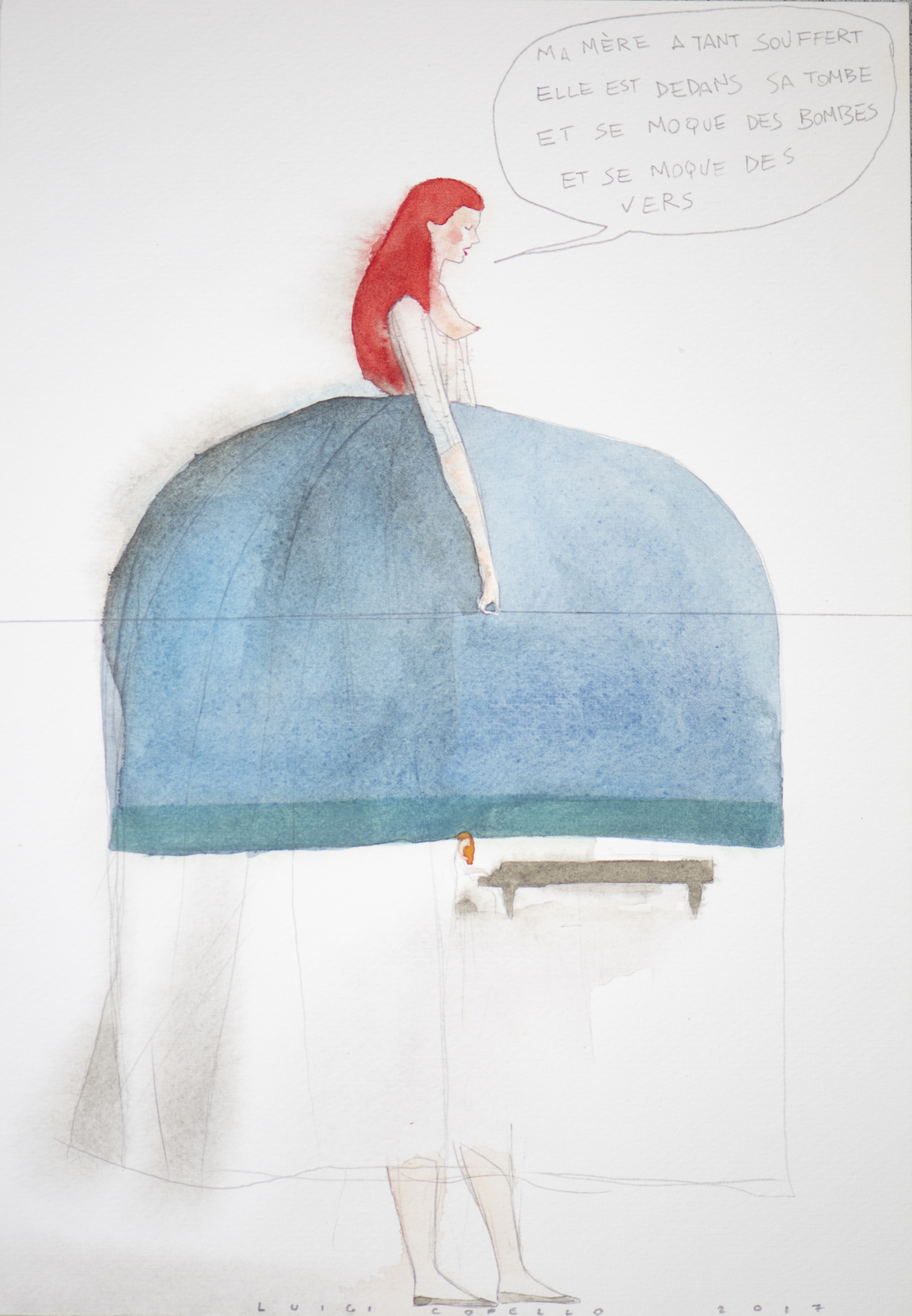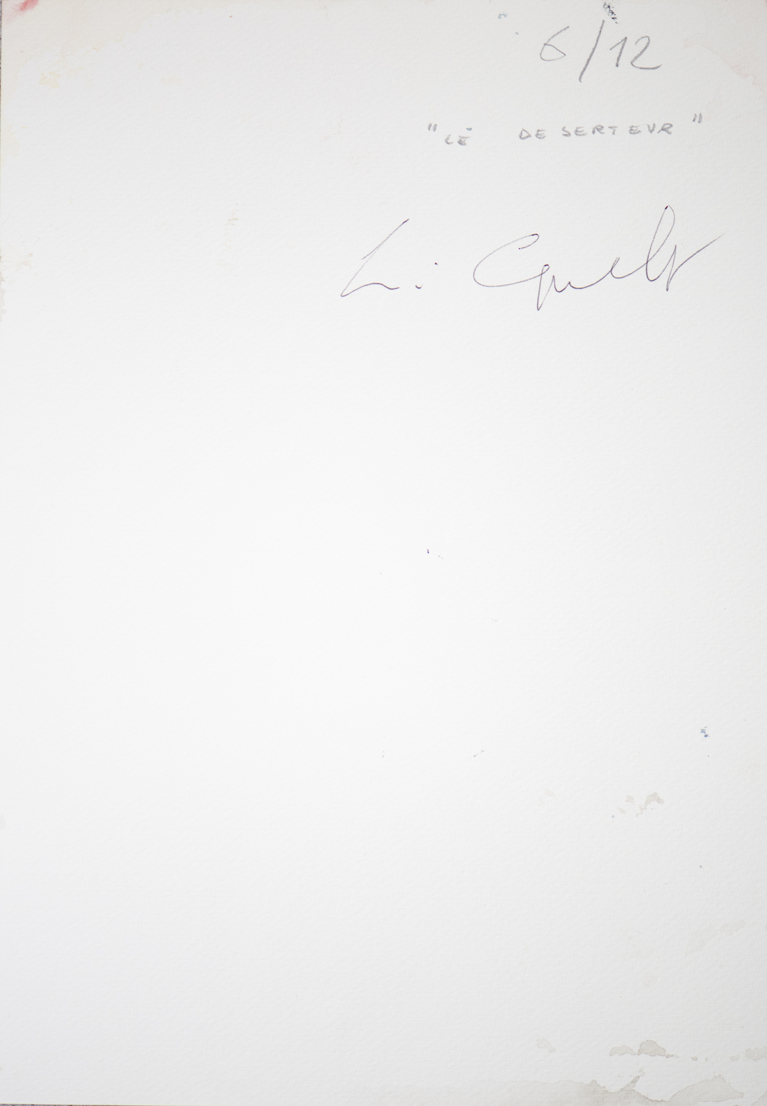Copello Luigi "Le Deserteur" opera completa che narra, illustra e racconta il celebre brano di Boris Vian del 1954. Acquerello su carta. Cm 36,00 x 25,00. Opera composta da 12 tavole consequenziali realizzate per illustrare in modo onirico, poetico, originalissimo la celebre canzone di Boris Vian, Le Deserteur, opera leggendaria della grande canzone francese d'autore e di protesta, scritta da Boris Vian nel 1954 e pubblicata nell'esecuzione di Marcel Mouloudji il 27 maggio di quello stesso anno, giorno della disfatta della Francia nella Battaglia di Dien Bien Phu, che segna la fine della guerra d'Indocina.