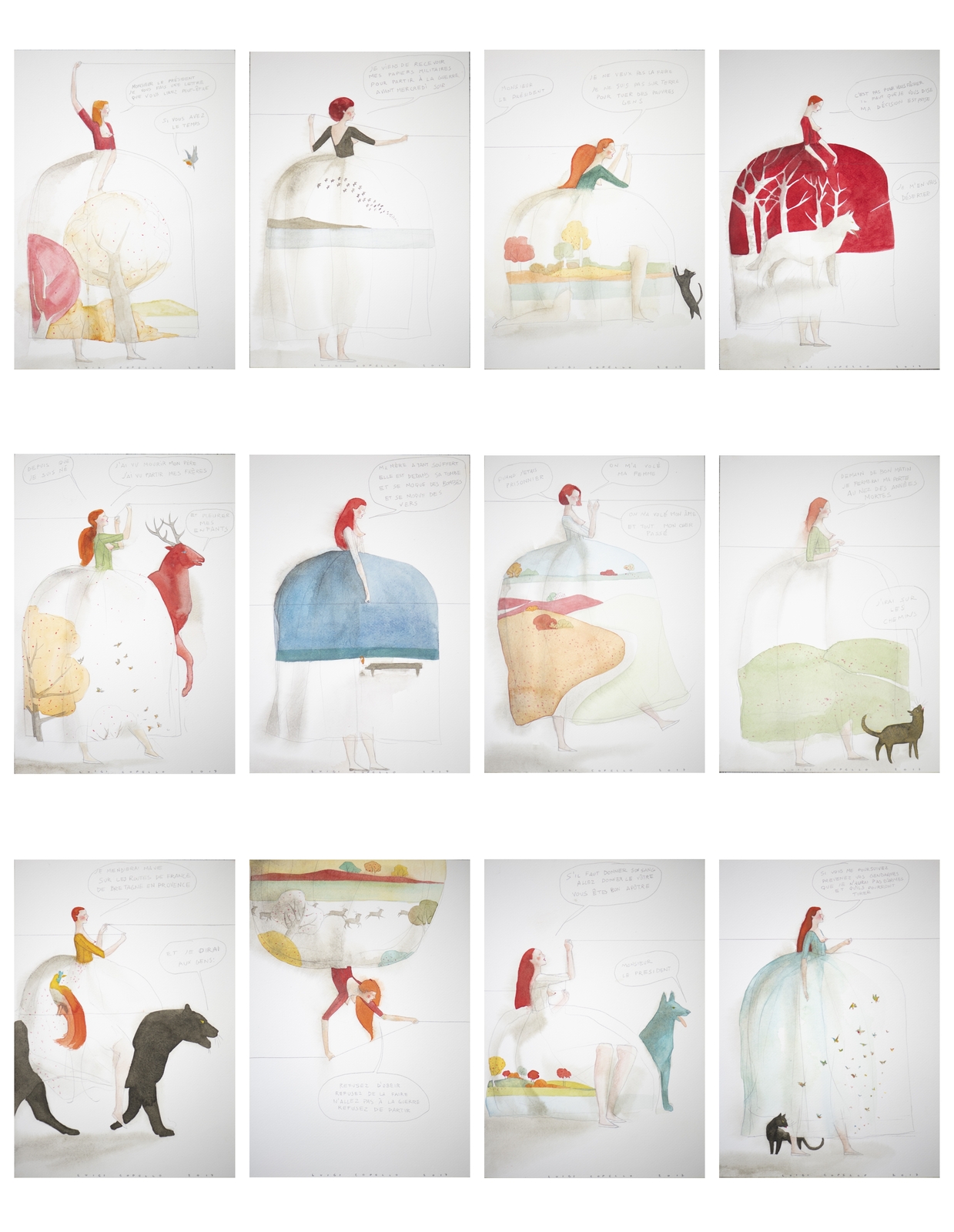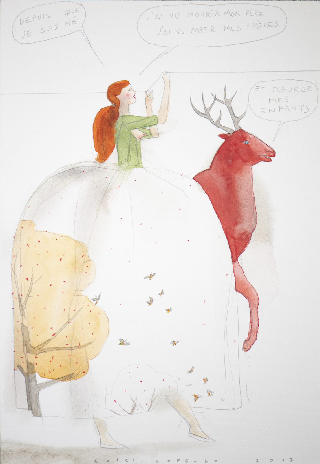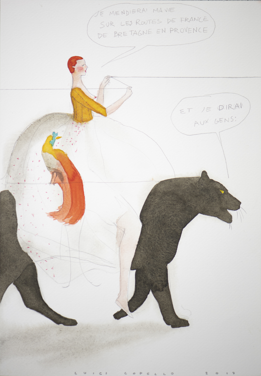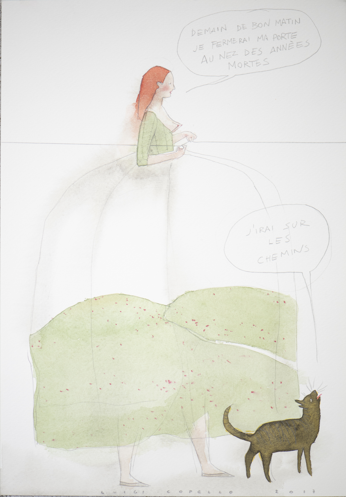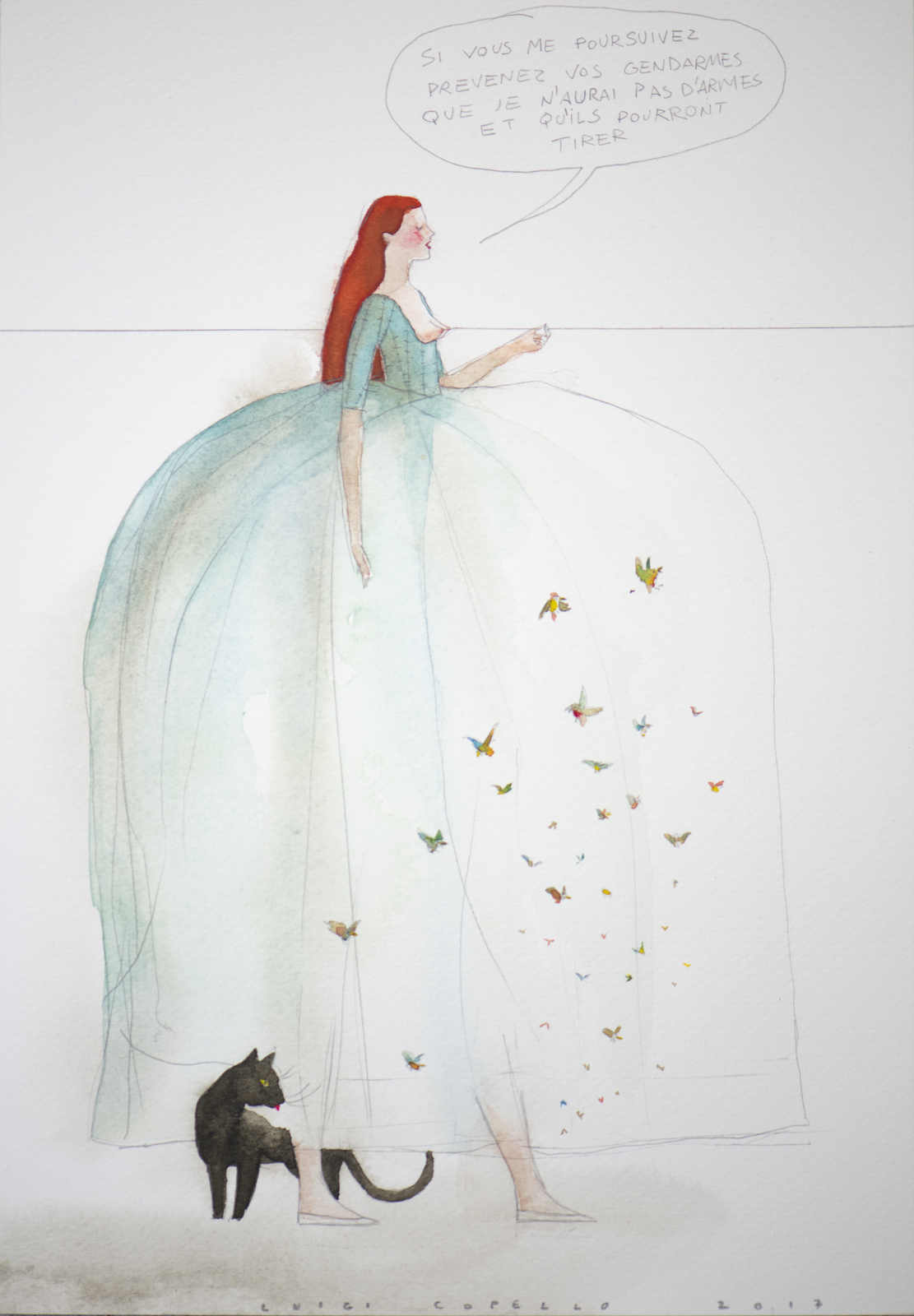 Copello Luigi "Le Deserteur" opera completa che narra, illustra e racconta il celebre brano di Boris Vian del 1954. Acquerello su carta. Cm 36,00 x 25,00. Opera composta da 12 tavole consequenziali realizzate per illustrare in modo onirico, poetico, originalissimo la celebre canzone di Boris Vian, Le Deserteur, opera leggendaria della grande canzone francese d'autore e di protesta, scritta da Boris Vian nel 1954 e pubblicata nell'esecuzione di Marcel Mouloudji il 27 maggio di quello stesso anno, giorno della disfatta della Francia nella Battaglia di Dien Bien Phu, che segna la fine della guerra d'Indocina.