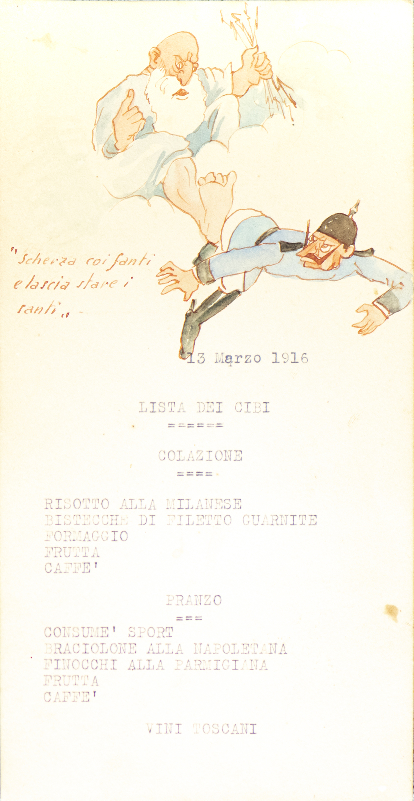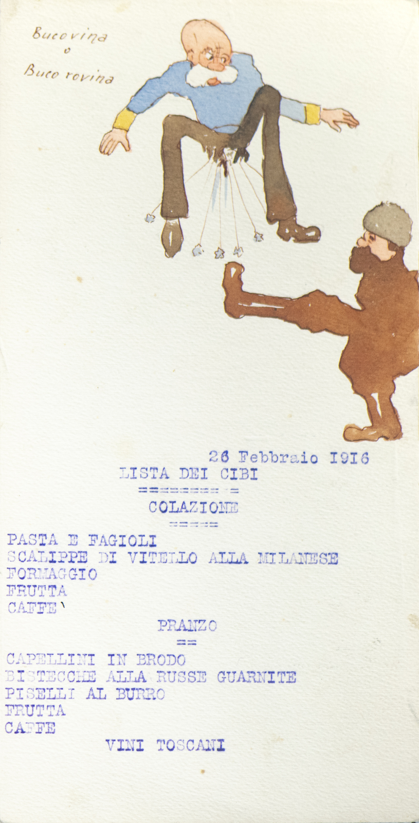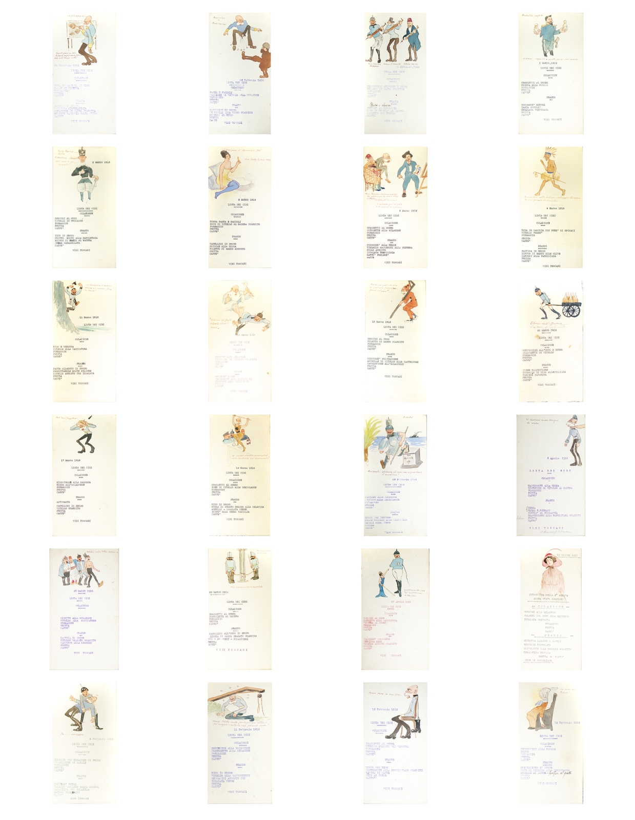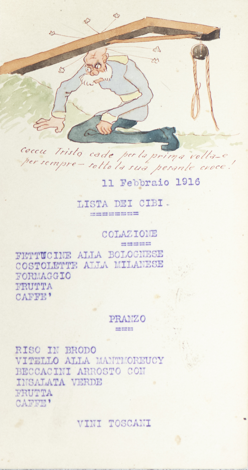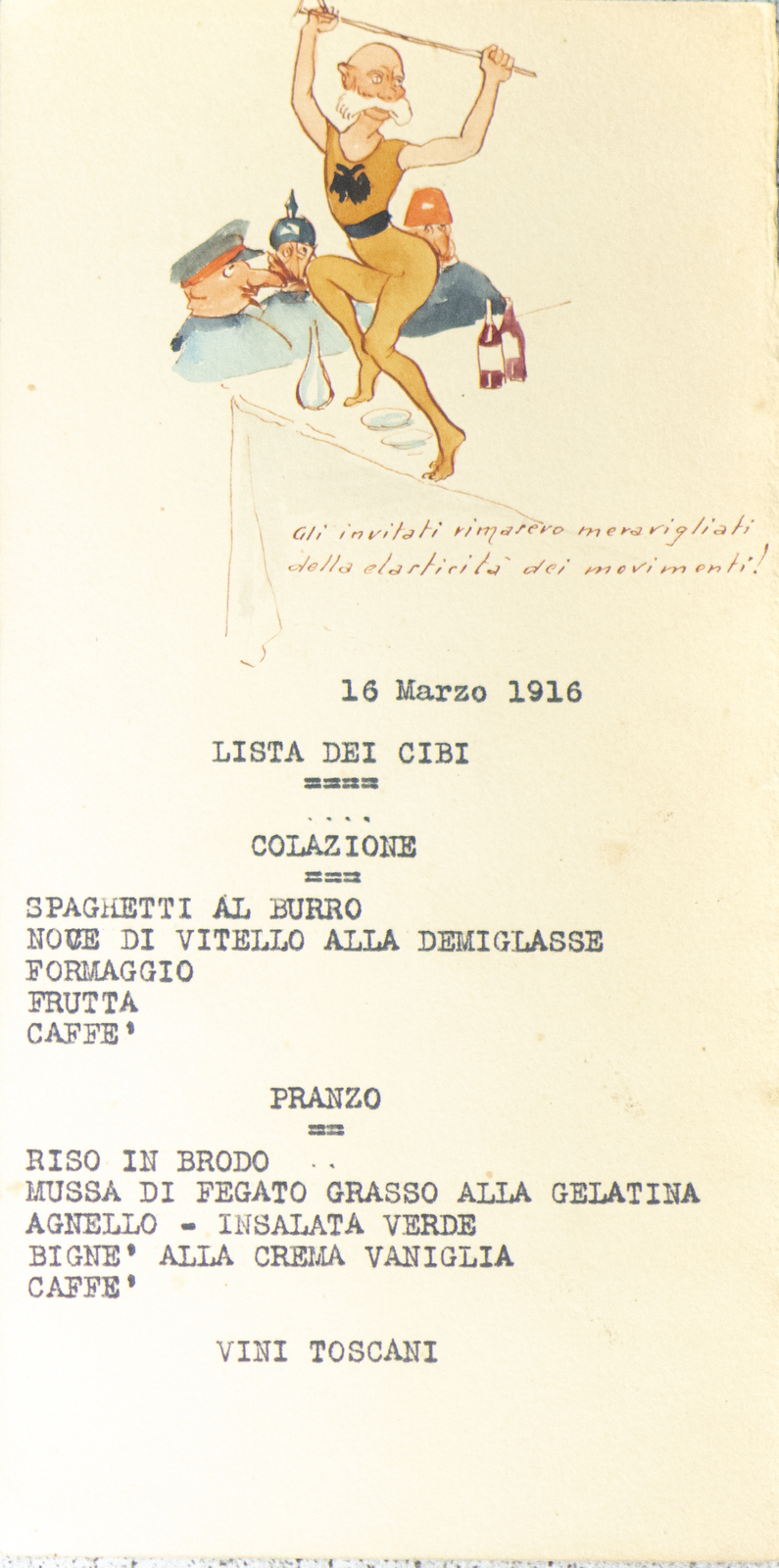 Serie di straordinarie e rarissime vignette satiriche/umoristiche del febbraio/marzo del 1916 sulle vicende della Triplice Intesa. Le immagini riproducono principalmente l’imperatore d’Austria Francesco Giuseppe, detto Cecco Beppe nel pieno Irridentismo e il Kaiser Guglielmo II ai tempi della Triplice Alleanza. Le opere provengono molto probabilmente dai menù preparati per la Mensa delle 2a armata dello stato maggiore, come riportato in un reperto del 1917. Hanno dimensioni che variano l'una dell'altra: la più piccola misura 20 di altezza per 10 cm di larghezza. In linea di massima le dimensioni si assomigliano.