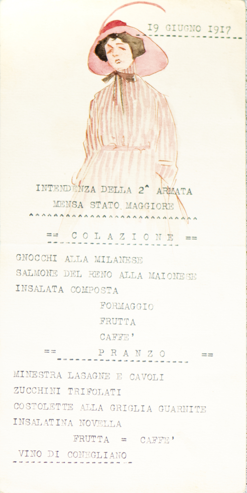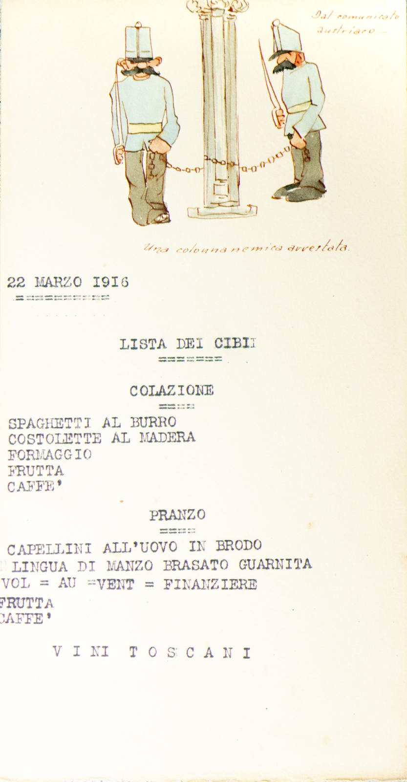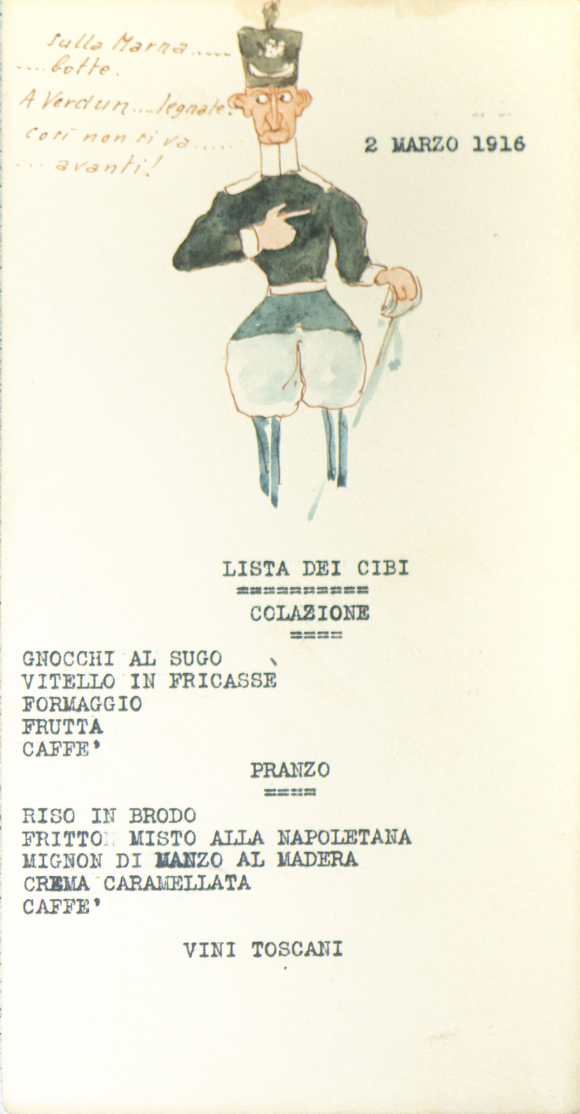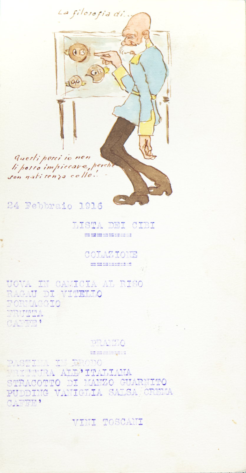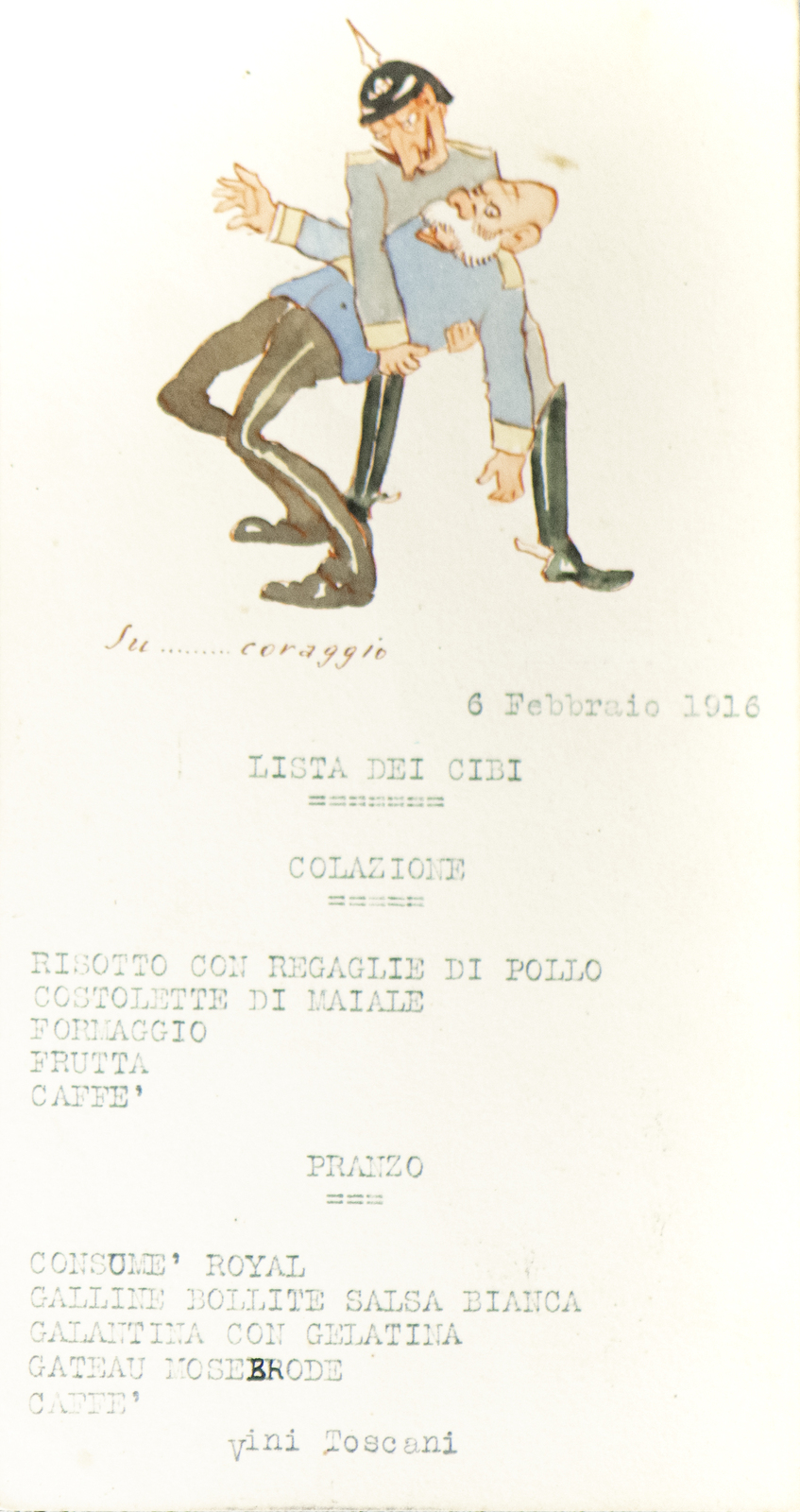 Serie di straordinarie e rarissime vignette satiriche/umoristiche del febbraio/marzo del 1916 sulle vicende della Triplice Intesa. Le immagini riproducono principalmente l’imperatore d’Austria Francesco Giuseppe, detto Cecco Beppe nel pieno Irridentismo e il Kaiser Guglielmo II ai tempi della Triplice Alleanza. Le opere provengono molto probabilmente dai menù preparati per la Mensa delle 2a armata dello stato maggiore, come riportato in un reperto del 1917. Hanno dimensioni che variano l'una dell'altra: la più piccola misura 20 di altezza per 10 cm di larghezza. In linea di massima le dimensioni si assomigliano.