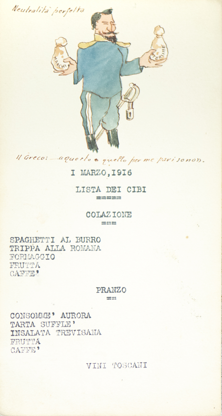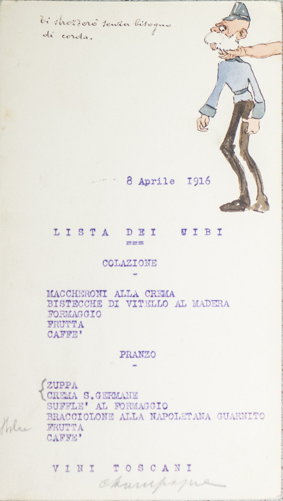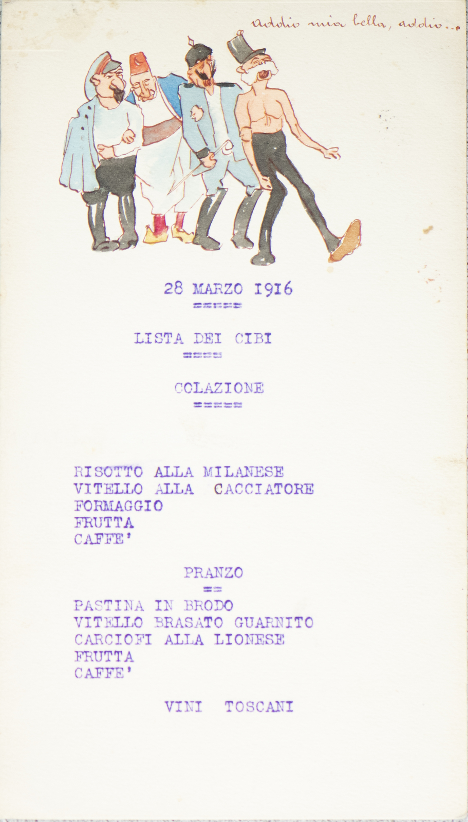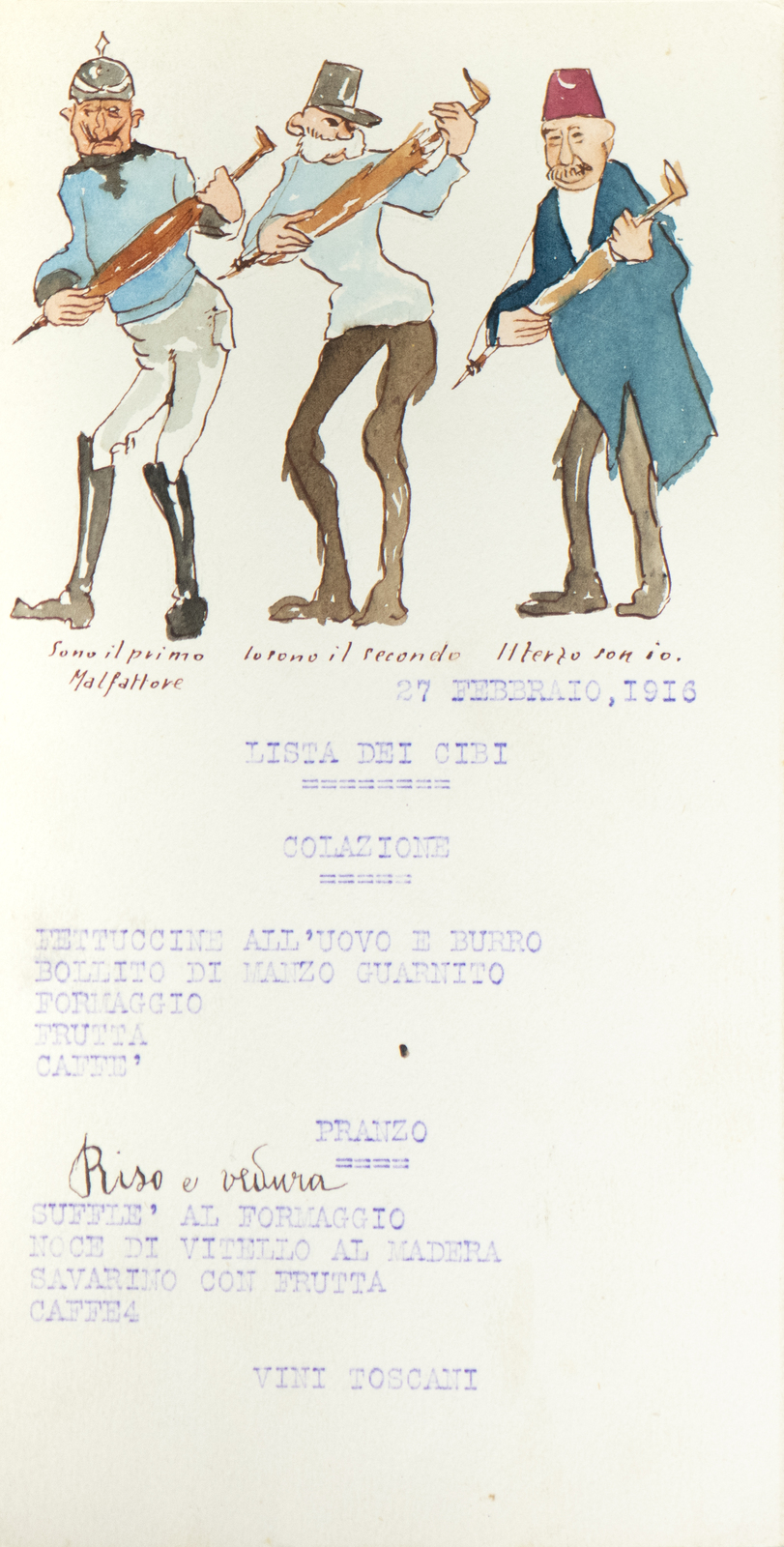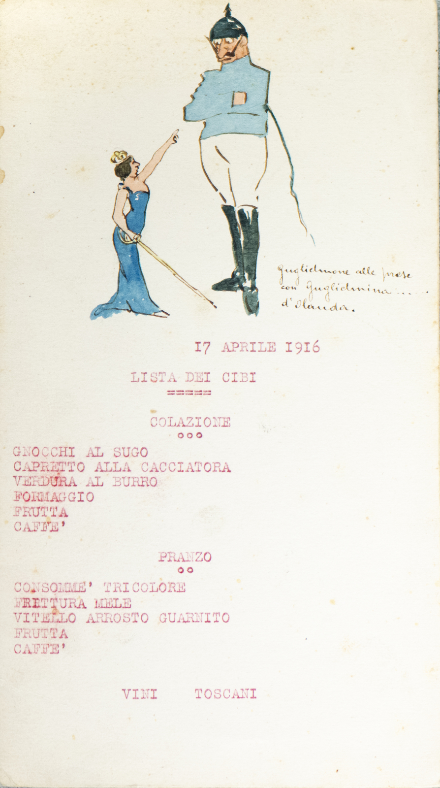 Serie di straordinarie e rarissime vignette satiriche/umoristiche del febbraio/marzo del 1916 sulle vicende della Triplice Intesa. Le immagini riproducono principalmente l’imperatore d’Austria Francesco Giuseppe, detto Cecco Beppe nel pieno Irridentismo e il Kaiser Guglielmo II ai tempi della Triplice Alleanza. Le opere provengono molto probabilmente dai menù preparati per la Mensa delle 2a armata dello stato maggiore, come riportato in un reperto del 1917. Hanno dimensioni che variano l'una dell'altra: la più piccola misura 20 di altezza per 10 cm di larghezza. In linea di massima le dimensioni si assomigliano.