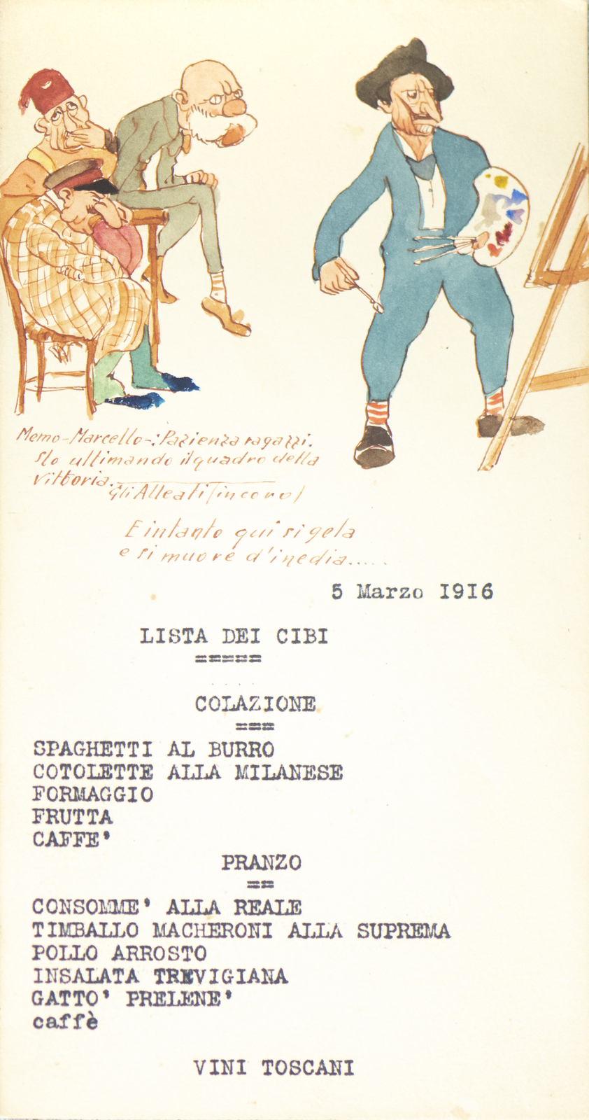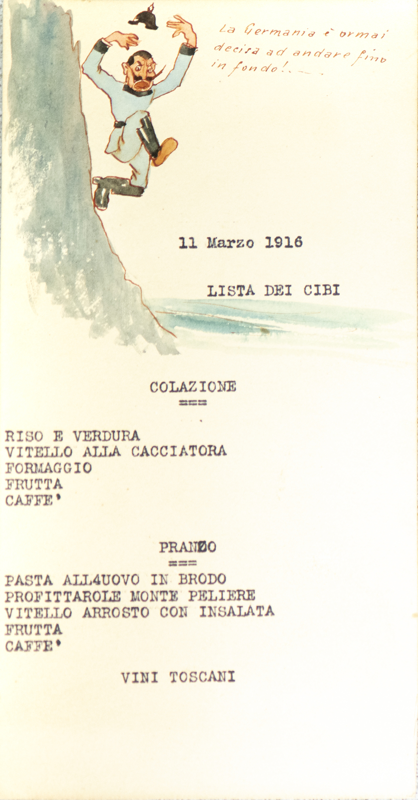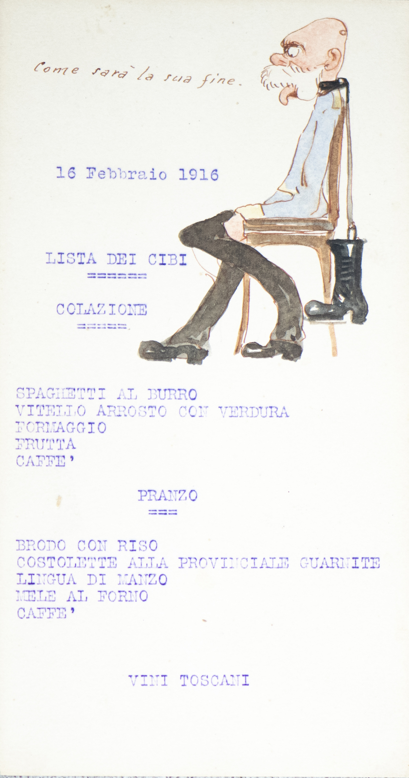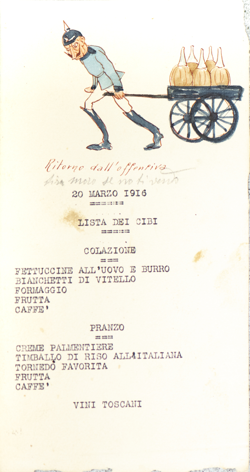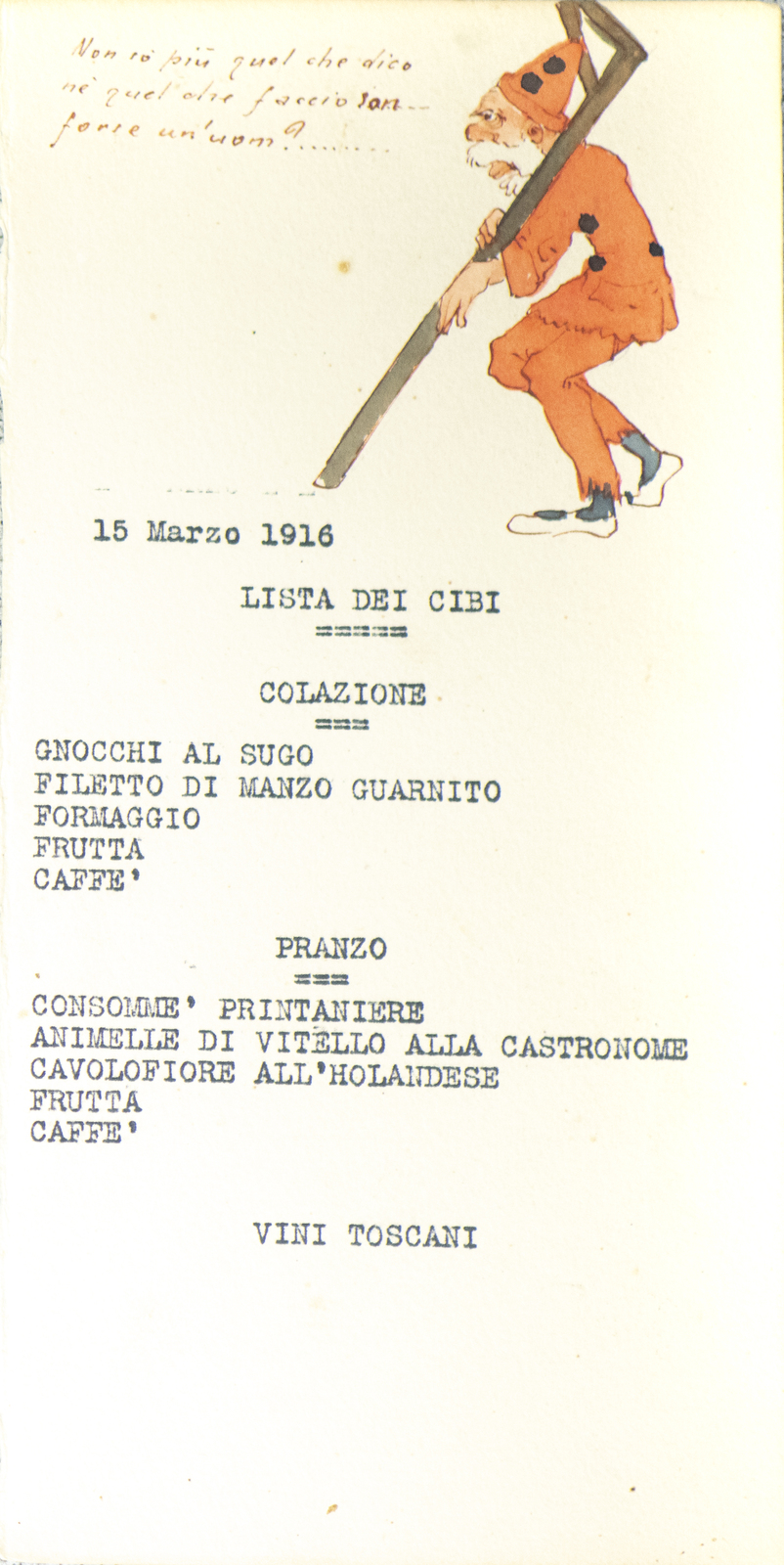 Serie di straordinarie e rarissime vignette satiriche/umoristiche del febbraio/marzo del 1916 sulle vicende della Triplice Intesa. Le immagini riproducono principalmente l’imperatore d’Austria Francesco Giuseppe, detto Cecco Beppe nel pieno Irridentismo e il Kaiser Guglielmo II ai tempi della Triplice Alleanza. Le opere provengono molto probabilmente dai menù preparati per la Mensa delle 2a armata dello stato maggiore, come riportato in un reperto del 1917. Hanno dimensioni che variano l'una dell'altra: la più piccola misura 20 di altezza per 10 cm di larghezza. In linea di massima le dimensioni si assomigliano.
