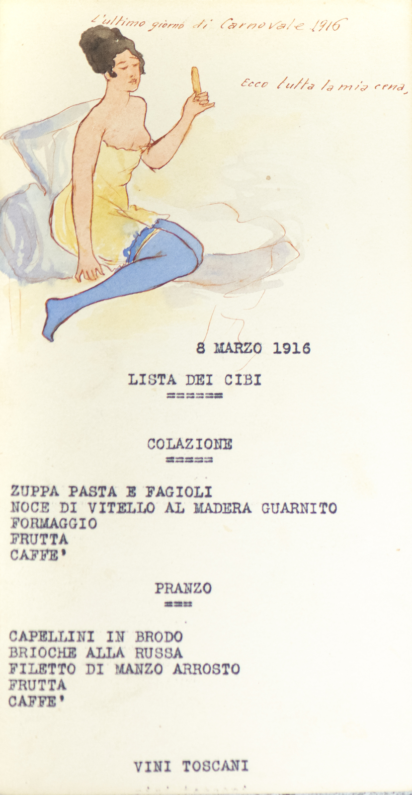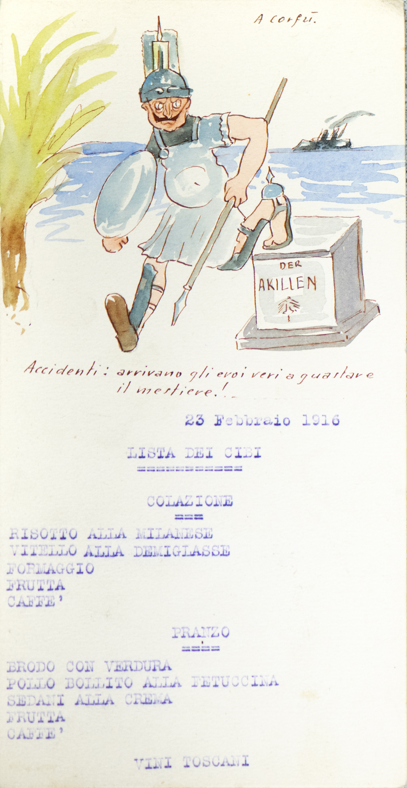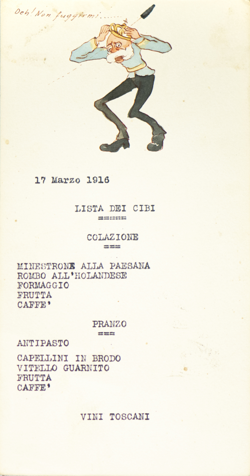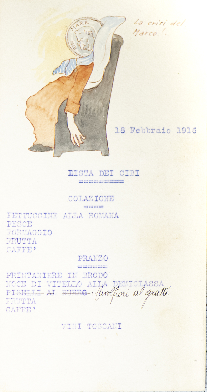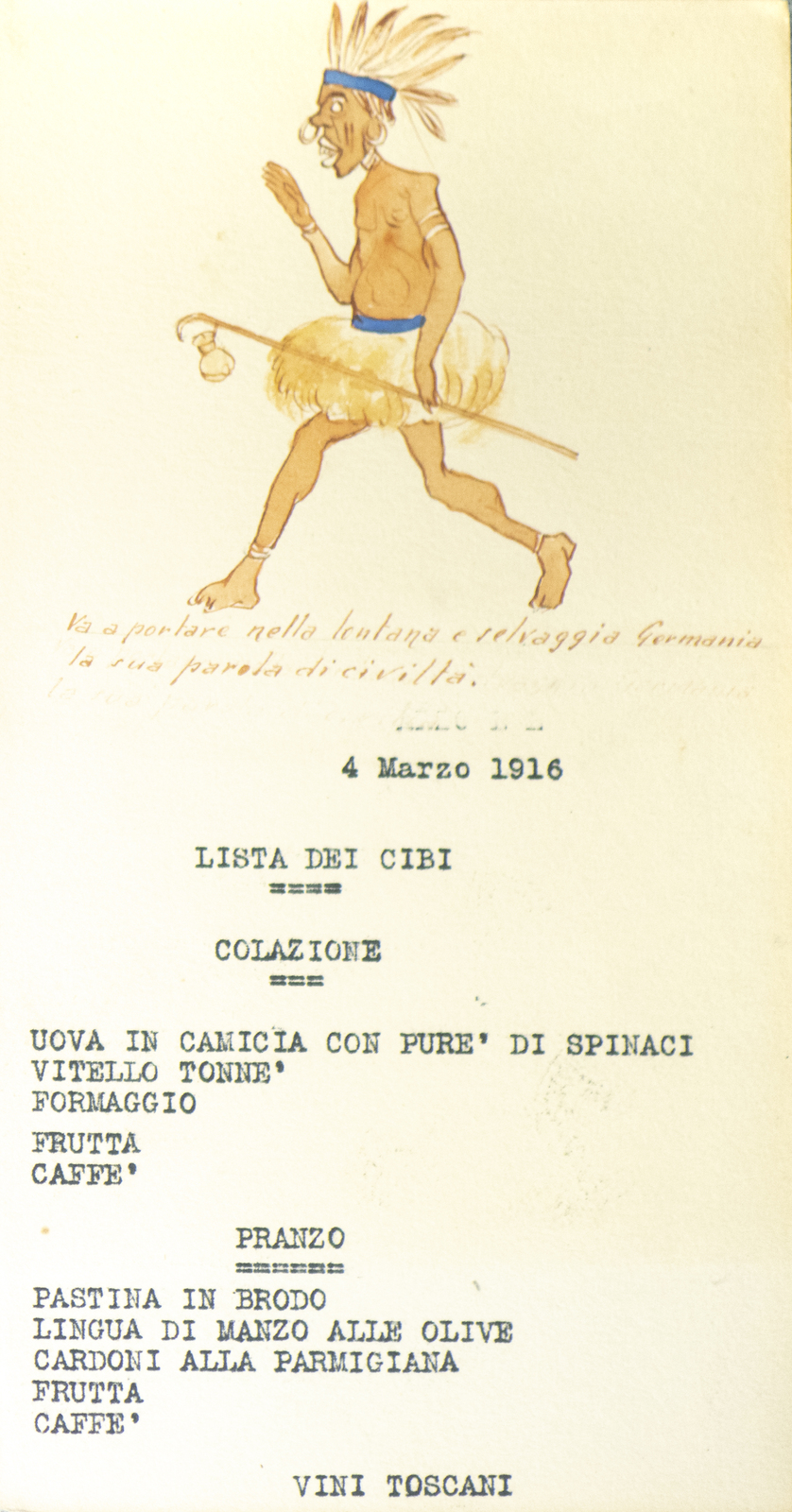 Serie di straordinarie e rarissime vignette satiriche/umoristiche del febbraio/marzo del 1916 sulle vicende della Triplice Intesa. Le immagini riproducono principalmente l’imperatore d’Austria Francesco Giuseppe, detto Cecco Beppe nel pieno Irridentismo e il Kaiser Guglielmo II ai tempi della Triplice Alleanza. Le opere provengono molto probabilmente dai menù preparati per la Mensa delle 2a armata dello stato maggiore, come riportato in un reperto del 1917. Hanno dimensioni che variano l'una dell'altra: la più piccola misura 20 di altezza per 10 cm di larghezza. In linea di massima le dimensioni si assomigliano.