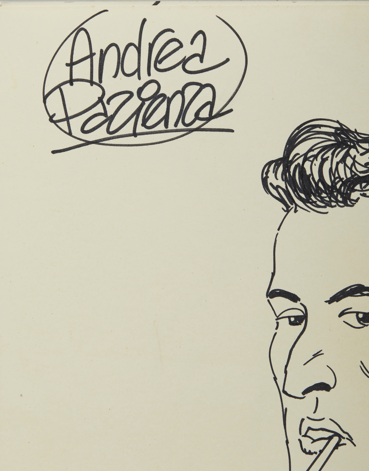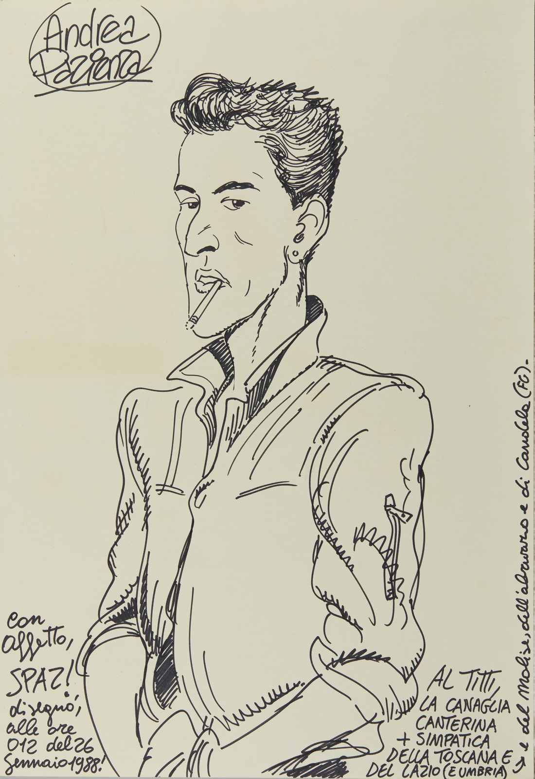PAZIENZA ANDREA “Dedicato al Titti, la canaglia canterina più simpatica della Toscana e del Lazio e Umbria e del Molise...”, h 12.00 del 26 gennaio 1988. 1988. pennarello su carta. Cm 33,00 x 48,00. Firma, data, dedica ad personam leggibile e che corre anche sulla dorsale destra del foglio.