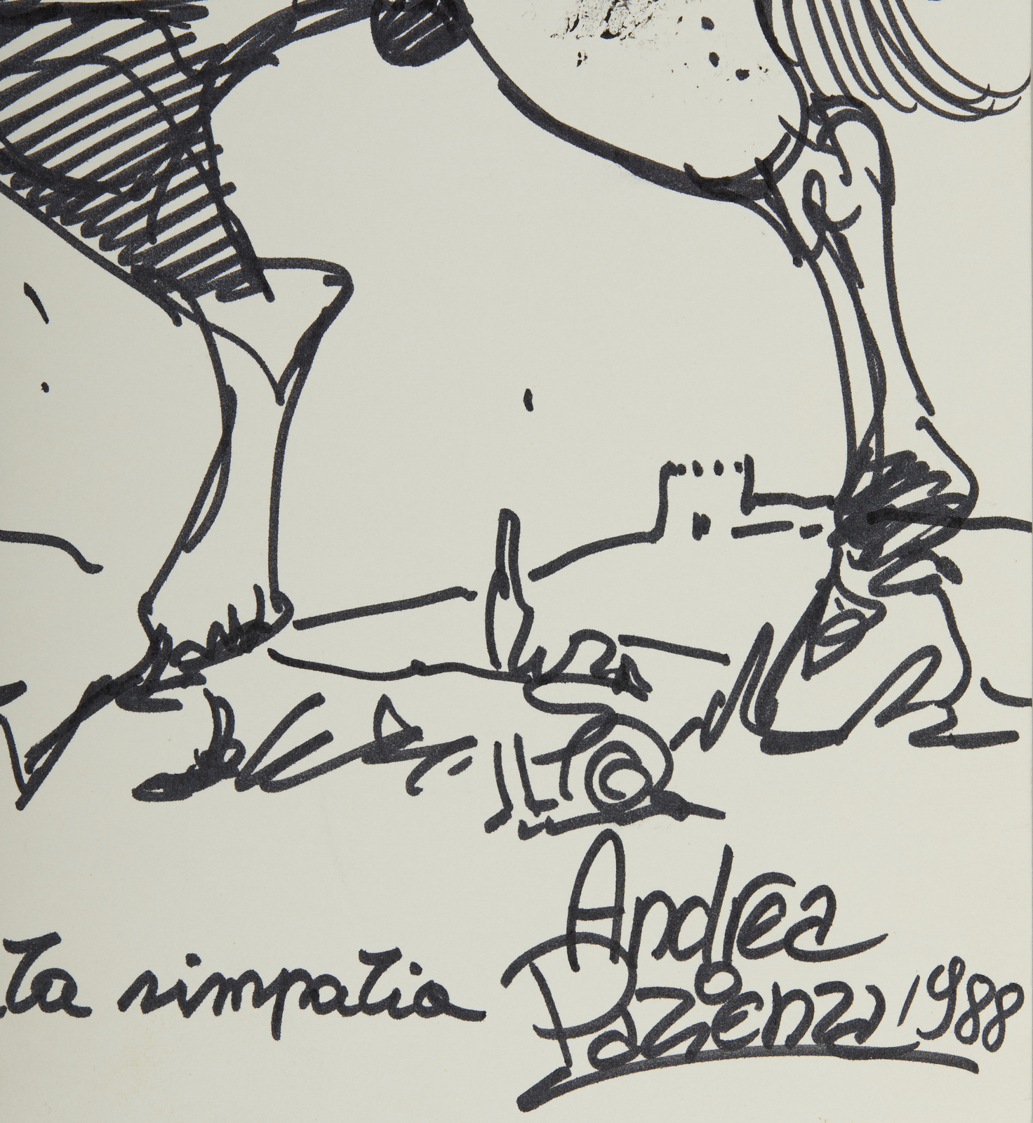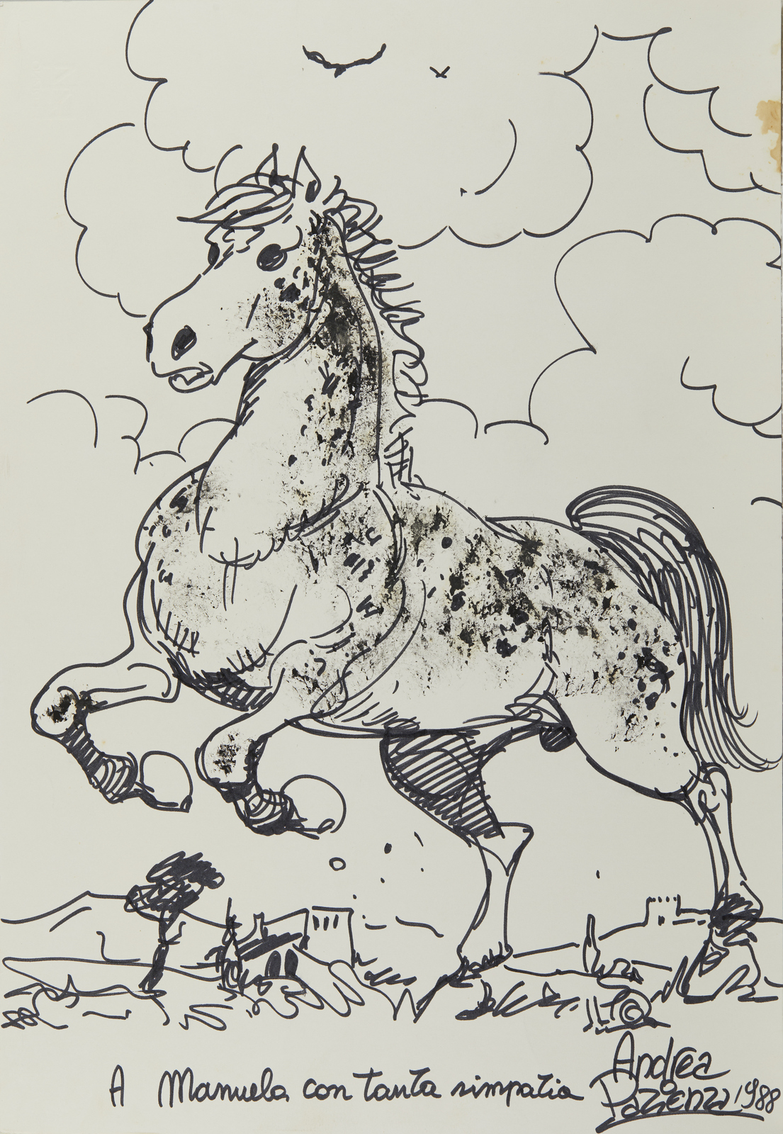 PAZIENZA ANDREA “Dedicato a Manuela”, 1988 (Cavallo). 1988. pastello, china e pennarello su carta. Cm 33,00 x 48,00. Firma, data, dedica ad personam.Firma, data, dedica ad personam