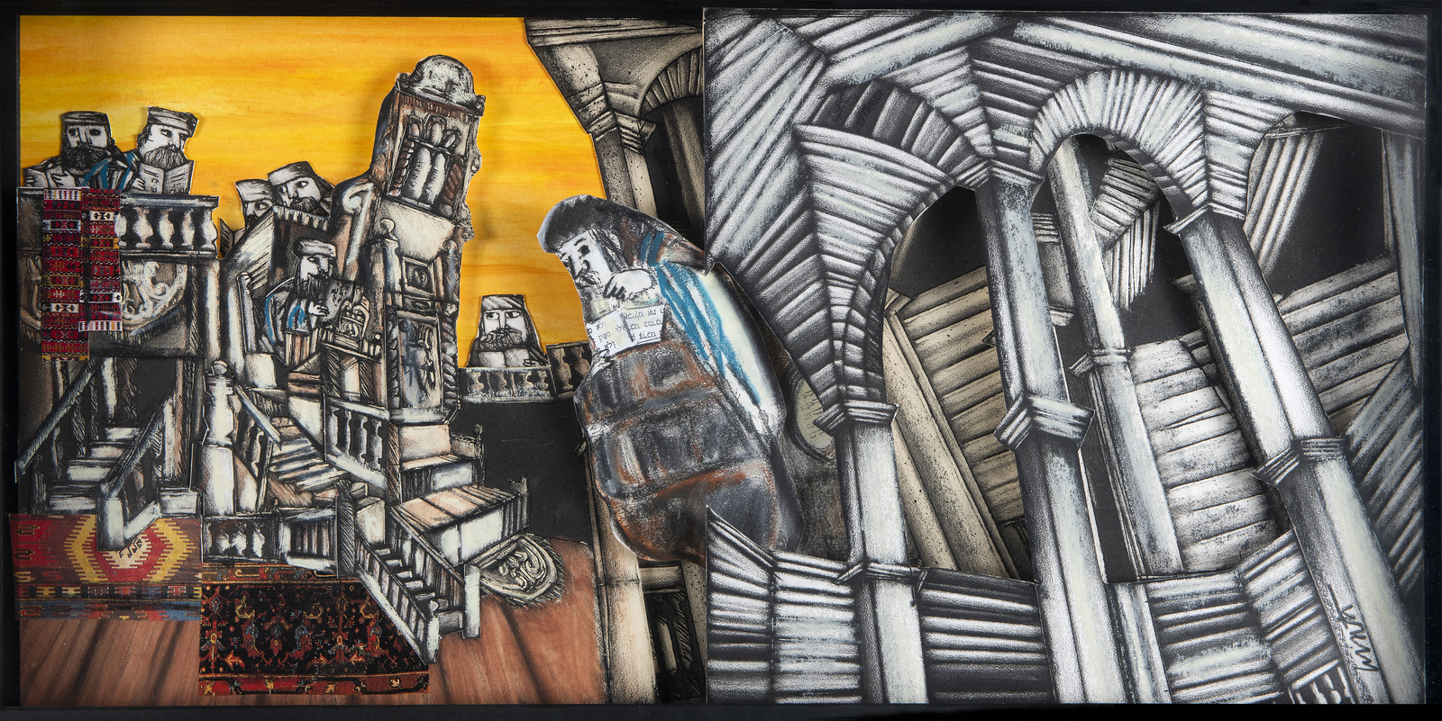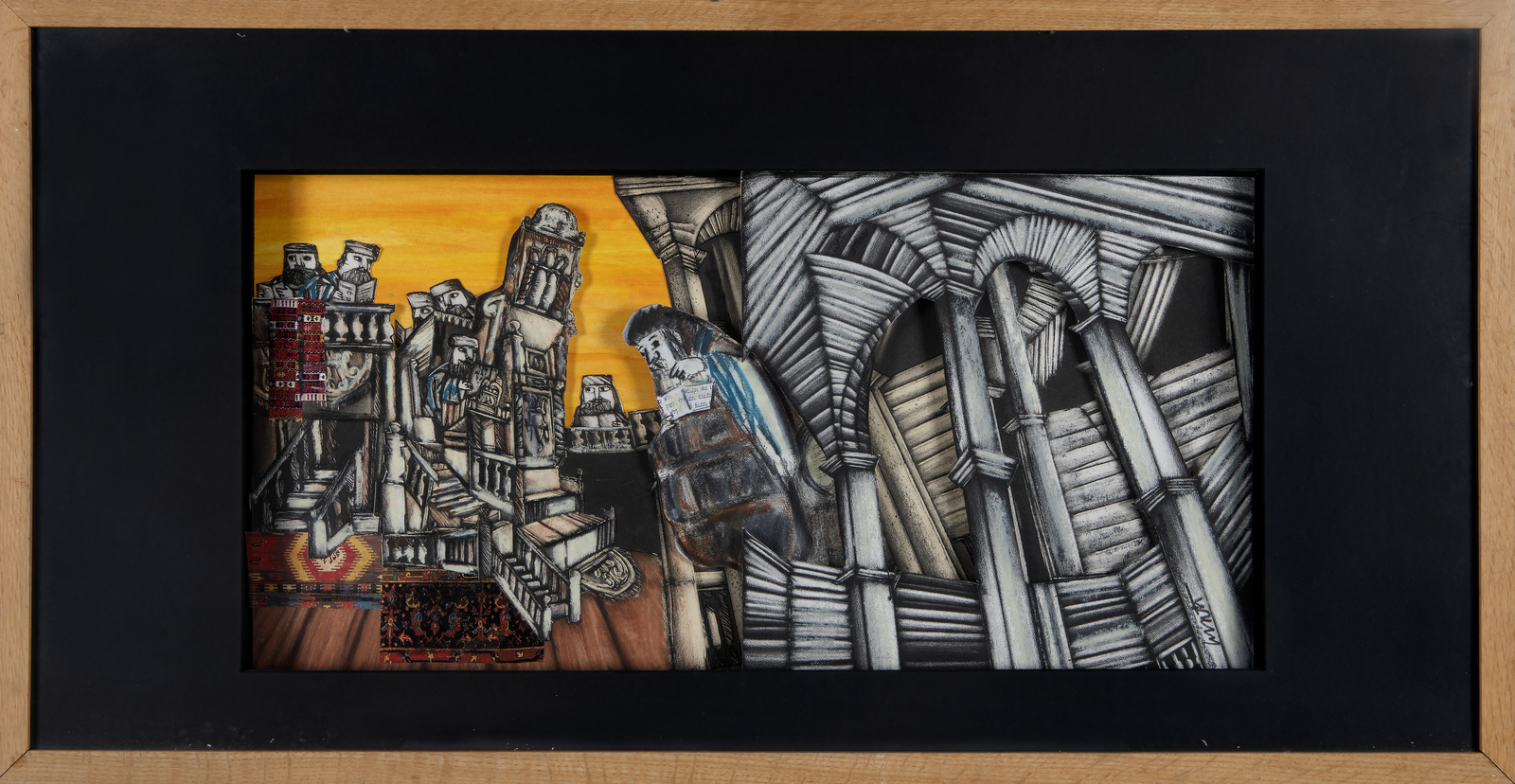 Una delle storiche scenografie eseguite per il Teatro dal Maestro con la sua storica tecnica di assemblage e collage ritagliati e disegnati anche su legno.