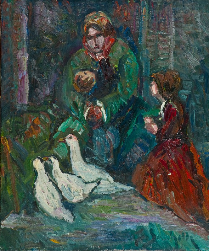 Franco Sacchetti (Venezia 1922 - Montecatini Terme (Pt) 1988) FIGURE E OCHE Olio su tela, cm. 60x50 Firmato in basso a sinistra.