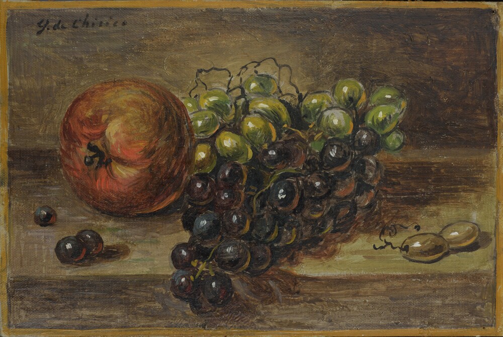 Firma in alto a sinistra G. de Chirico. Dichiarazione d'autenticità al verso: Questa: "Vita silente di frutta sopra un tavolo", è opera autentica, da me eseguita e firmata. Giorgio de Chirico. In cornice. Autentica su foto della Fondazione Giorgio e Isa de Chirico, Roma, 10 giugno 2024.