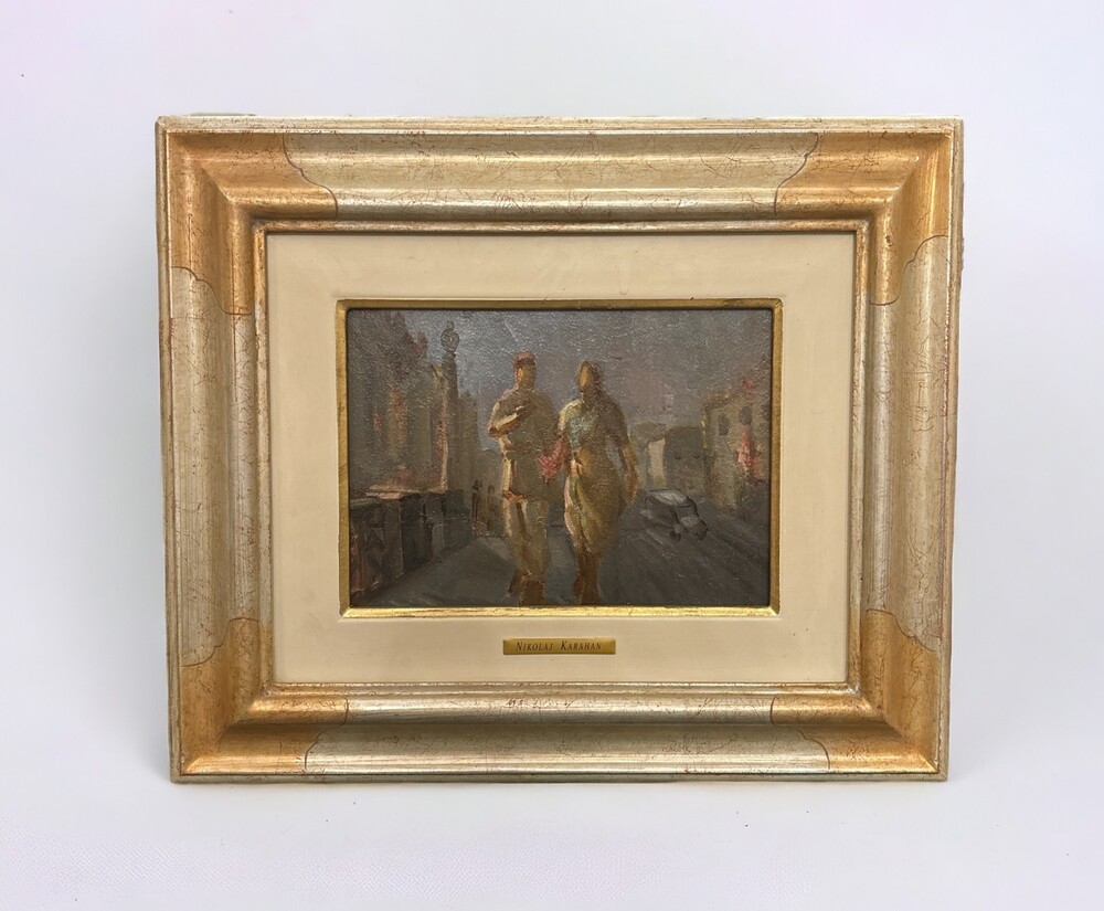 Nikolaj Karahan - Figure a passeggio olio su tavoletta 17 x 23,5 cm Al retro...
