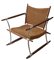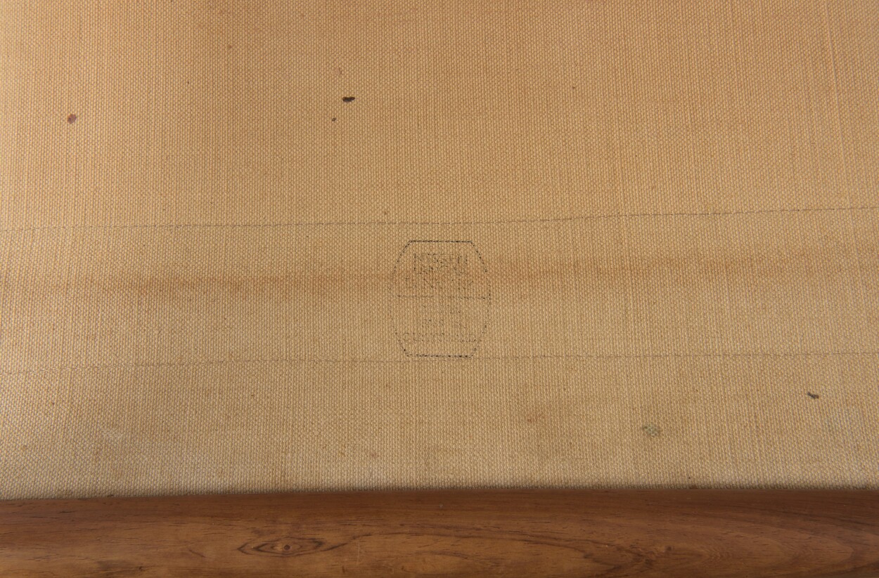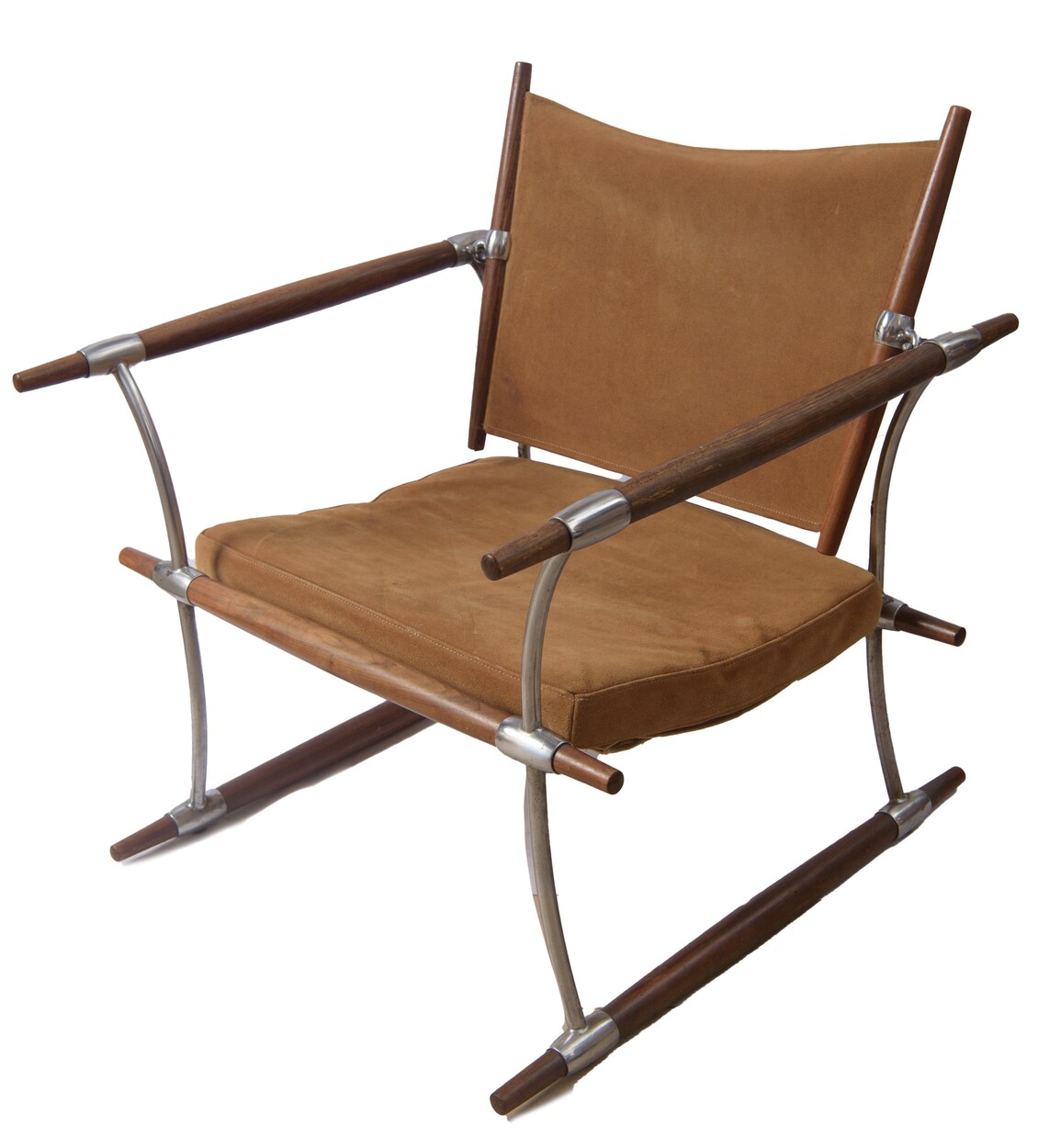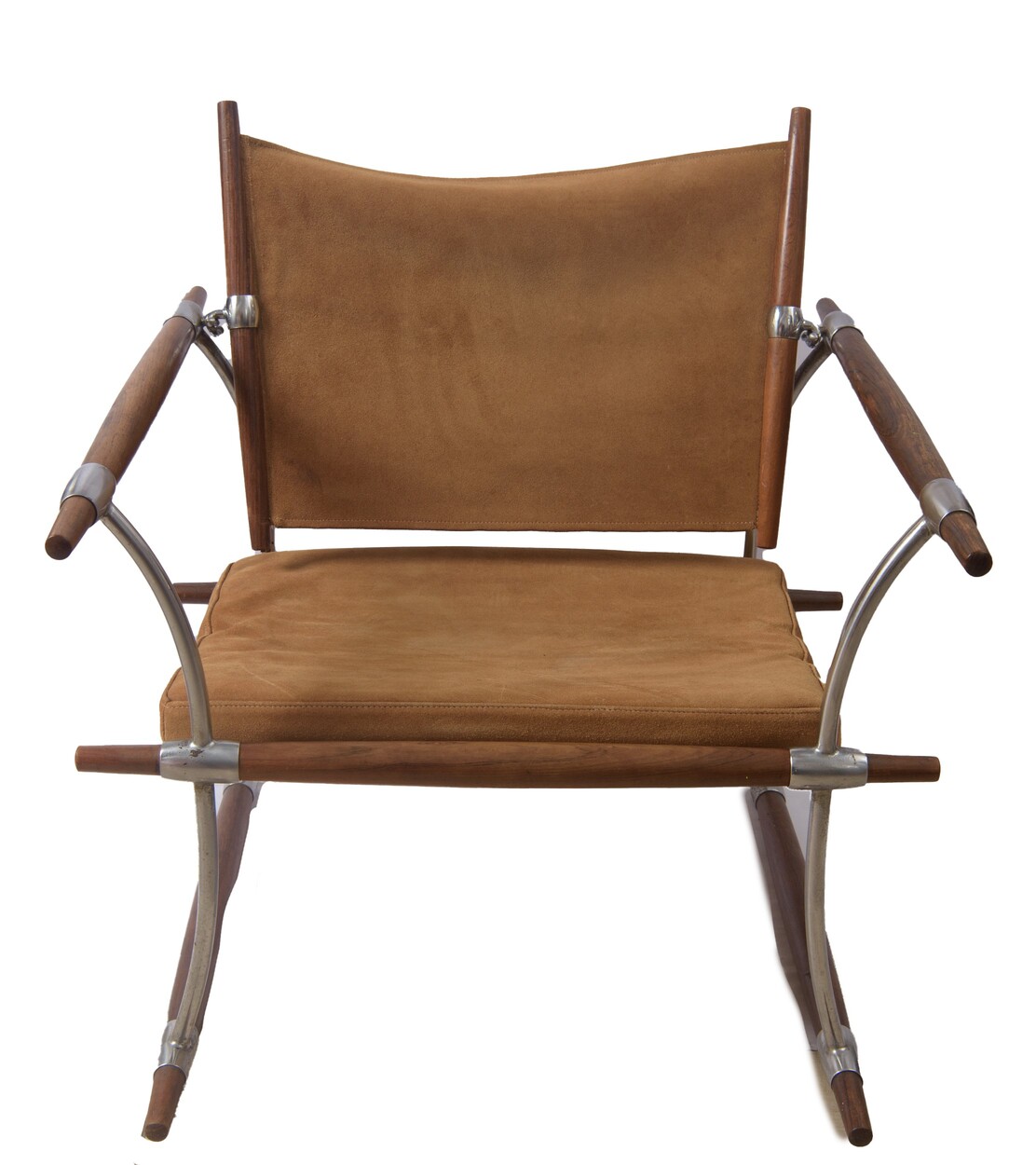 In legno di rose, con rifiniture in metallo cromato. Schienale e sedile in pelle scamosciata. Marchio Nissen, Denmark sul tessuto.
