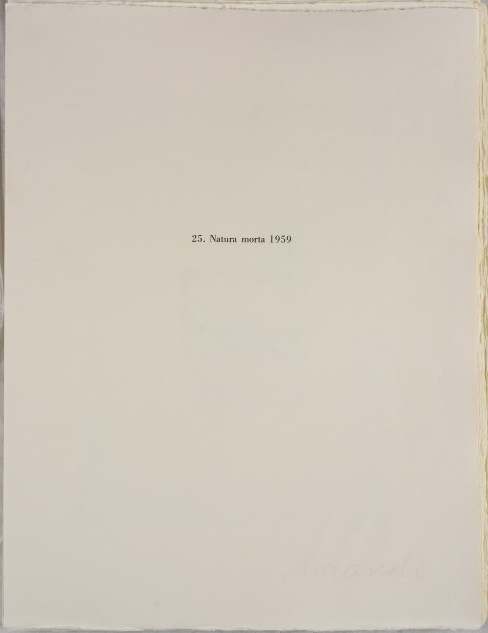 Tratta dall'edizione n. 13/120 (presente sul colophon). Firmato in lastra. L'opera è stampata in fotolitografia su carta di cotone fatta a mano molto spessa (con velina protettiva originale), progettata e prodotta appositamente per questa edizione dalla cartiera Miliani di Fabriano. Il foglio è raccolto in un'altra cartella di carta di cotone fatta a mano leggermente più sottile, recante la firma dell'artista "Morandi" in filigrana, realizzata appositamente dalla cartiera Enrico Magnani di Pescia.