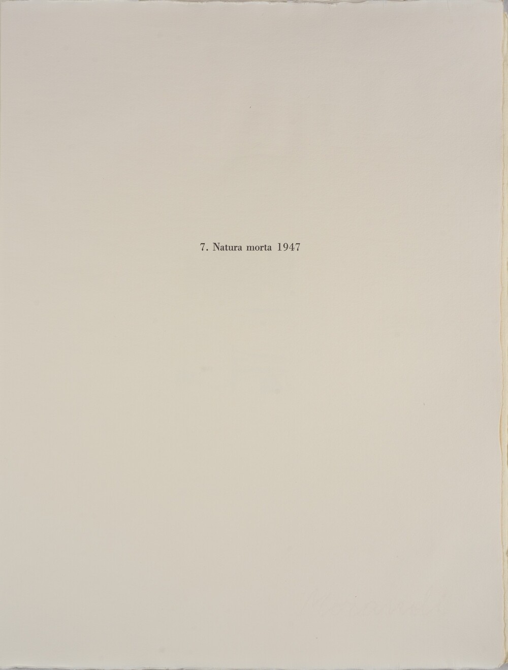 Tratta dall'edizione n. 13/120 (presente sul colophon). Firmato in lastra. L'opera è stampata in fotolitografia su carta di cotone fatta a mano molto spessa (con velina protettiva originale), progettata e prodotta appositamente per questa edizione dalla cartiera Miliani di Fabriano. Il foglio è raccolto in un'altra cartella di carta di cotone fatta a mano leggermente più sottile, recante la firma dell'artista "Morandi" in filigrana, realizzata appositamente dalla cartiera Enrico Magnani di Pescia.