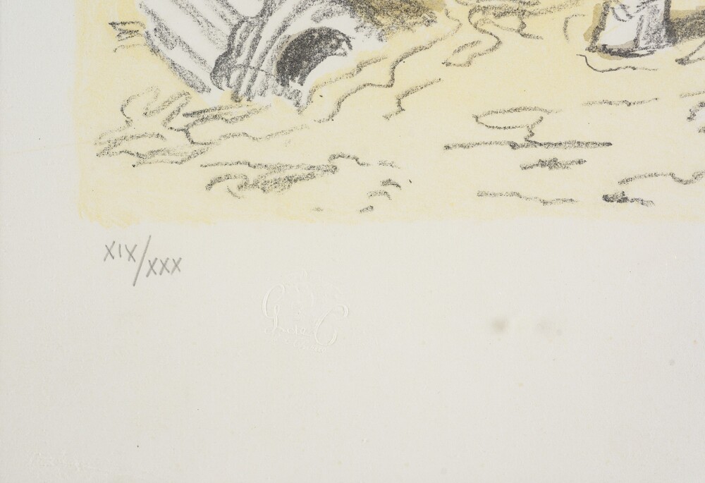 Es. n. XIX/XXX. Tiratura e firma in basso a matita. Timbro a secco Giorgio De Chirico. Timbro a secco Alberto Caprini Stampatore. Edizione totale: 99 esmplari in numeri romani e XXX esemplari in numeri arabi.