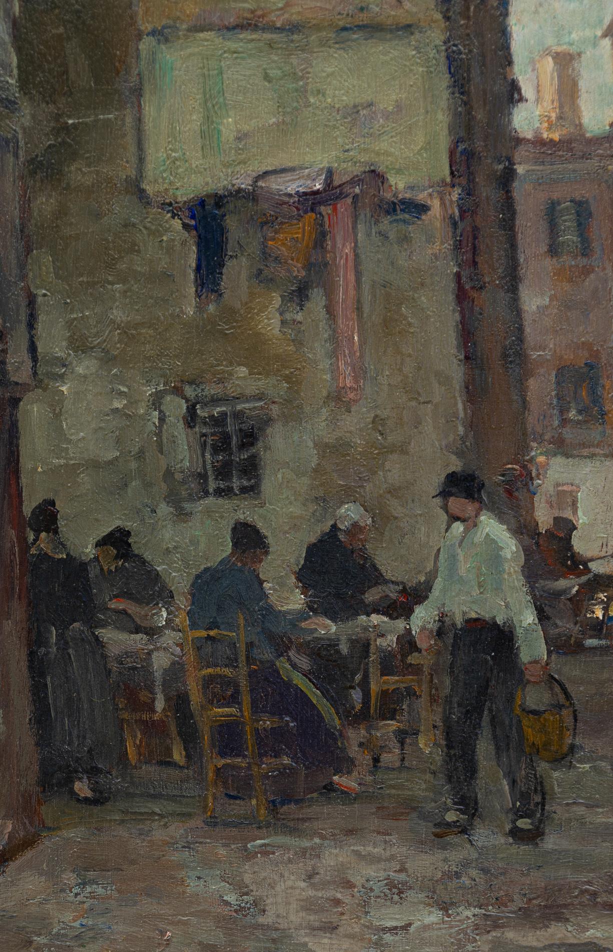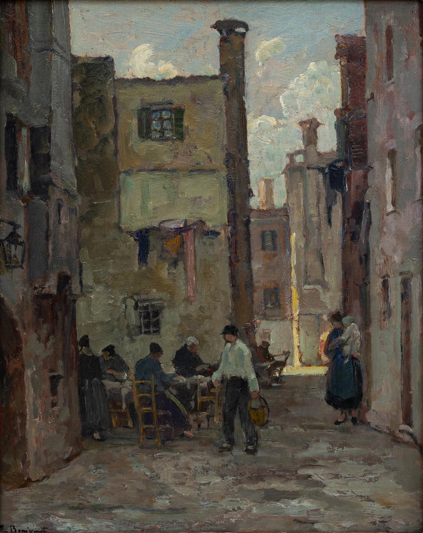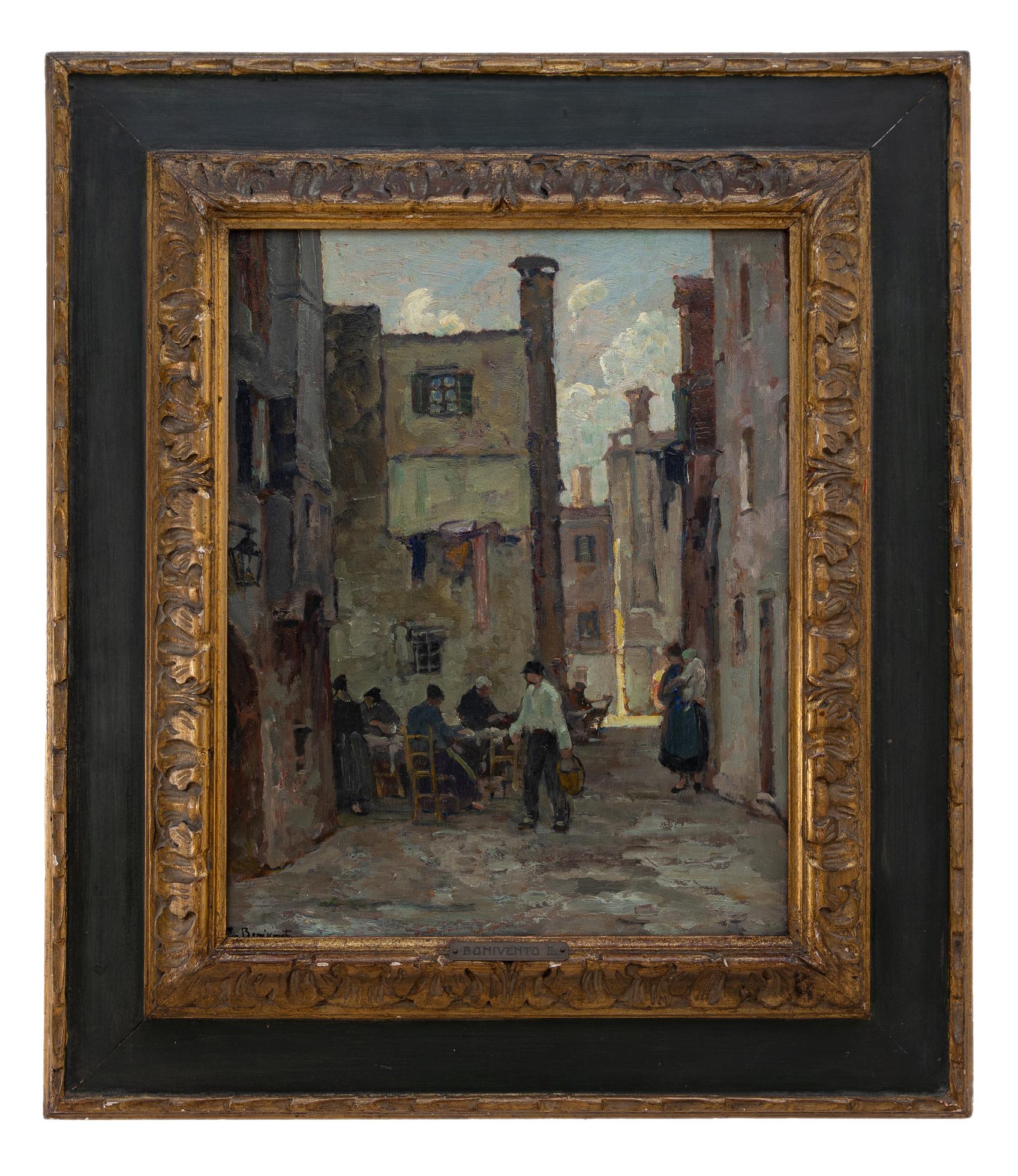 Eugenio Bonivento - Lavorando la stoffa - Chioggia 1880-Milano 1956 - Olio su tavola cm 44x35