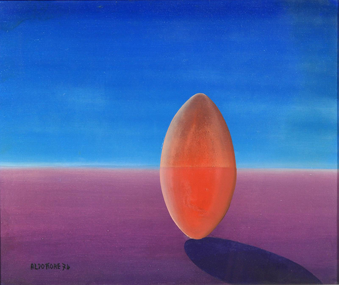 Fiore Aldo (XX secolo) olio su tela, cm 50x50 firmato e datato in basso a sinistra: Aldo Fiore 74 Uovo in uno spazio totale utopico come assoluto Provenienza: Galleria Apogeo, Napoli