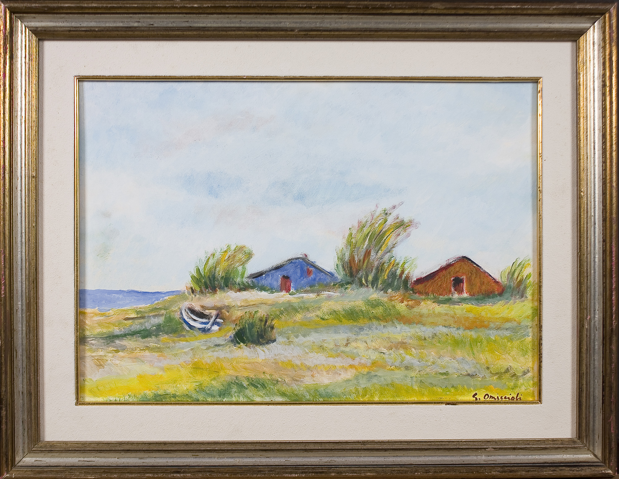Giovanni Omiccioli (1901-1975) Case con barche a Passoscuro Olio su cartone...