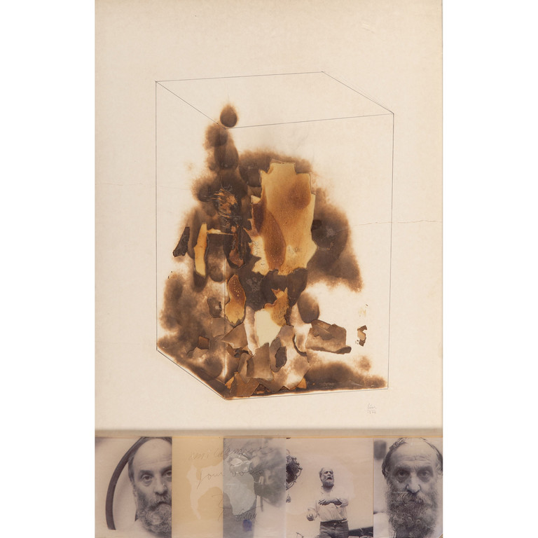 combustion and collage on cardboard in a plexiglass box 40 94x27 16 in