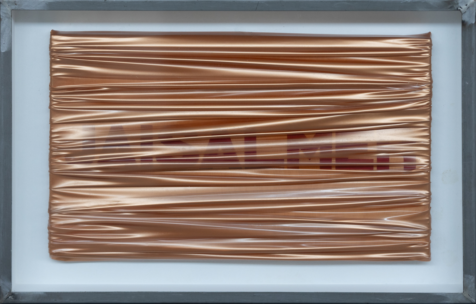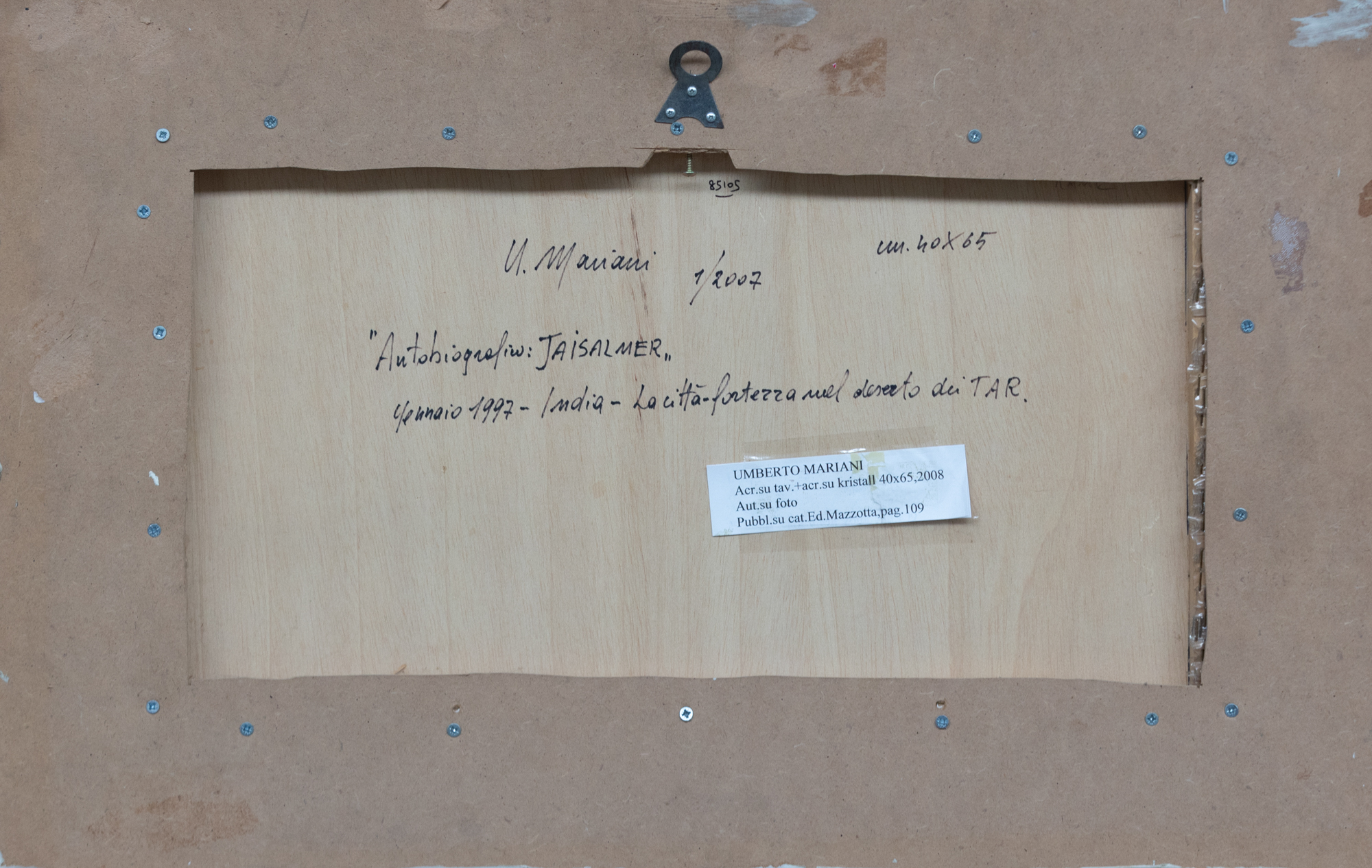 Kristall e acrilico su tavola, cornice in ferro dell'artista