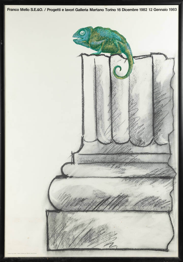 Manifesto della mostra "Franco Mello S.E.&O. Progetti e lavori", Galleria Martano, Torino, 16 dicembre 1982-12 gennaio 1983