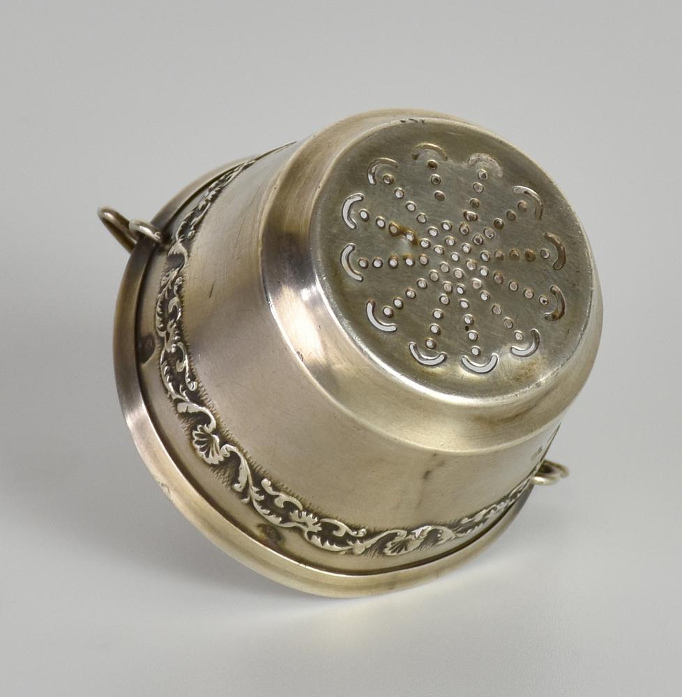 argento 950/1000, decorazione a cesello, fornito di forcella per essere infilato nel beccuccio della teiera; marchio di garanzia della città di Parigi
