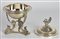 argento 800/1000, lavorazione a sbalzo e cesello, piede triangolare con sostegno a tripode impreziosito da motivi neoclassici a volute; presa del coperchio configurata a cigno con ali aperte