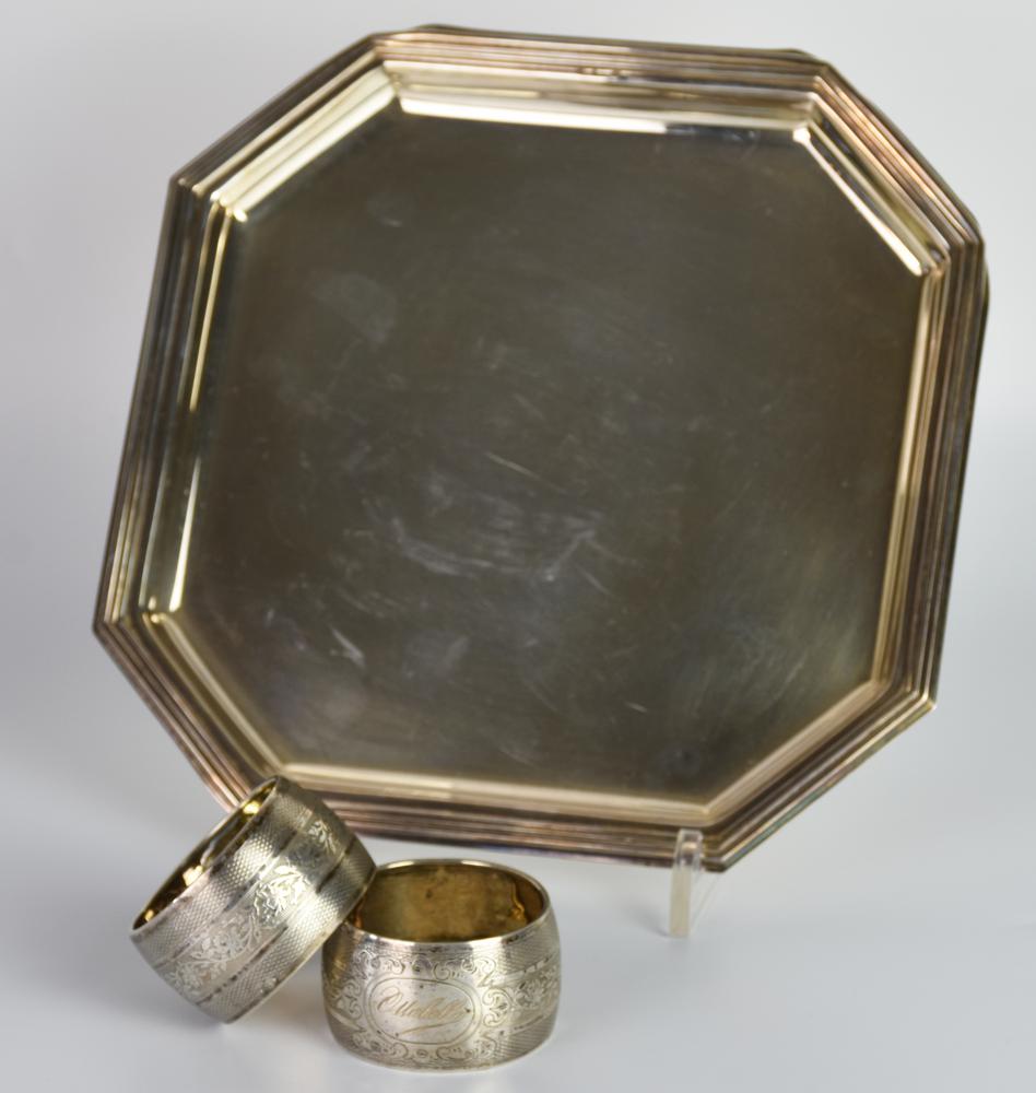 LOTTO DI TRE OGGETTI DA TAVOLA IN ARGENTO costituito da: Vassoio ottagonale,...