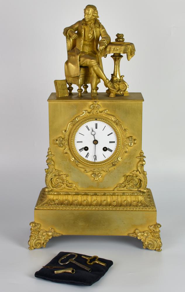 orologio in bronzo con doratura al mercurio, quadrante bianco con numeri romani; a coronamento una rappresentazione di Gioacchino Rossini, al quale rimandano i due libri (titolo libro sul tavolino "Barbier de Seville" titolo del libro appoggiato alla sedia "Figaro oeuvre diverses")