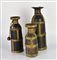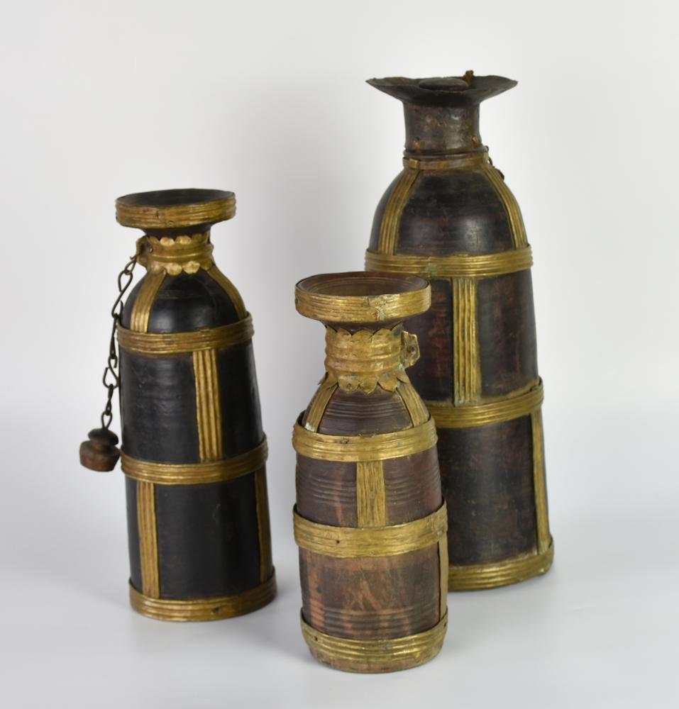LOTTO DI TRE BOTTIGLIE IN LEGNO E OTTONE struttura in legno con fasce in...