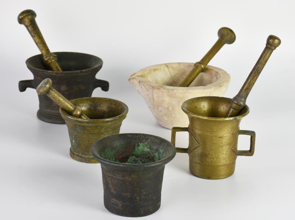Mortaio in bronzo con due piccoli manici e pestello in ottone, XVIII secolo