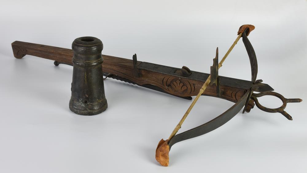 LOTTO DI DUE OGGETTI costituito da: Balestra da scena legno intagliato e...