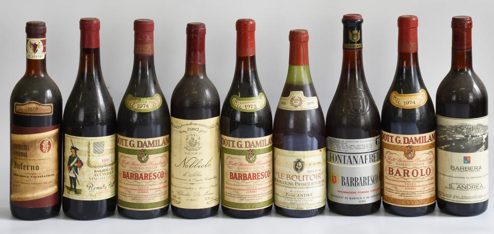 LOTTO DI NOVE BOTTIGLIE DI VINO DI VARIETA' E EPOCA DIFFERENTI