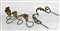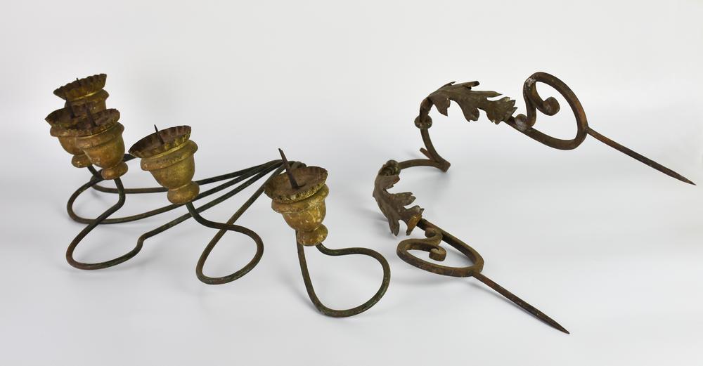 struttura a due bracci curvi desinenti a ricciolo decorati con foglie in lamierino cesellato e dorato; due lunghi spuntoni di ferro per il cero, si fissa al muro con anello
