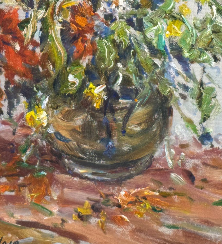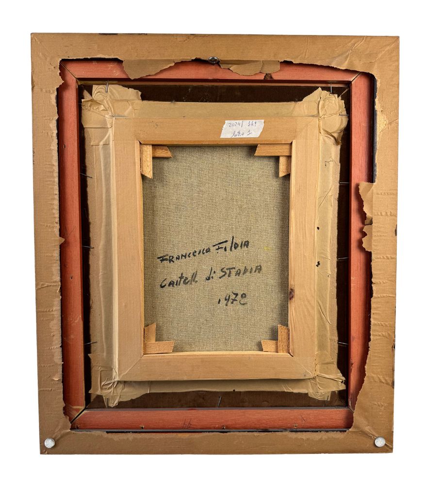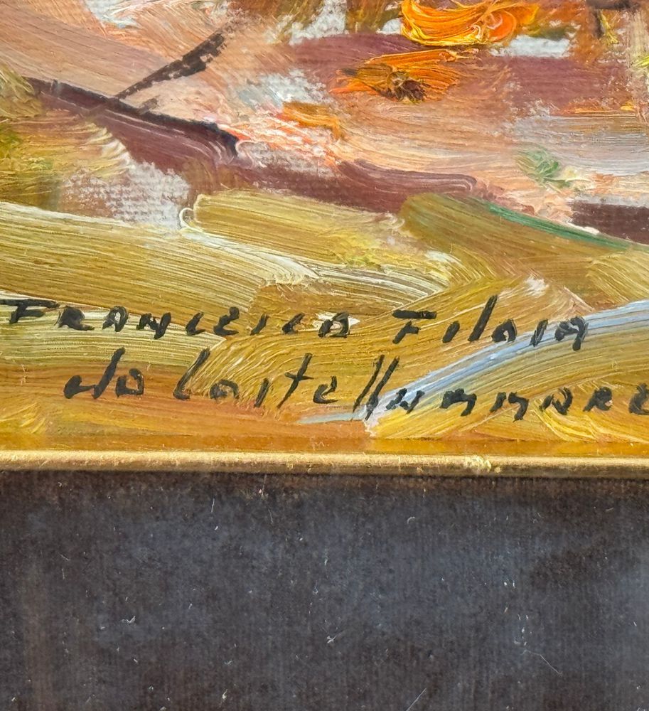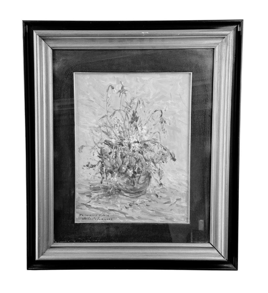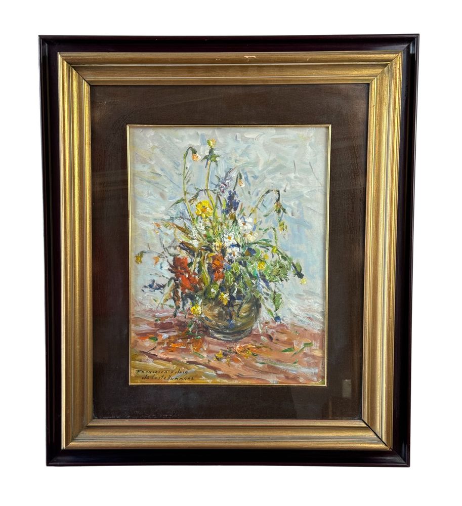 Dipinto olio su tela, periodo XX secolo scuola Italiana, raffigurante Vaso con fiori. Dimensioni compreso cornice: 55x65 cm. Dimensioni interno cornice: 30x40 cm. Reca firma in basso a sinistra e autentica sul retro da Francesco Filosa (1979). Opera in buone condizioni.