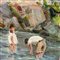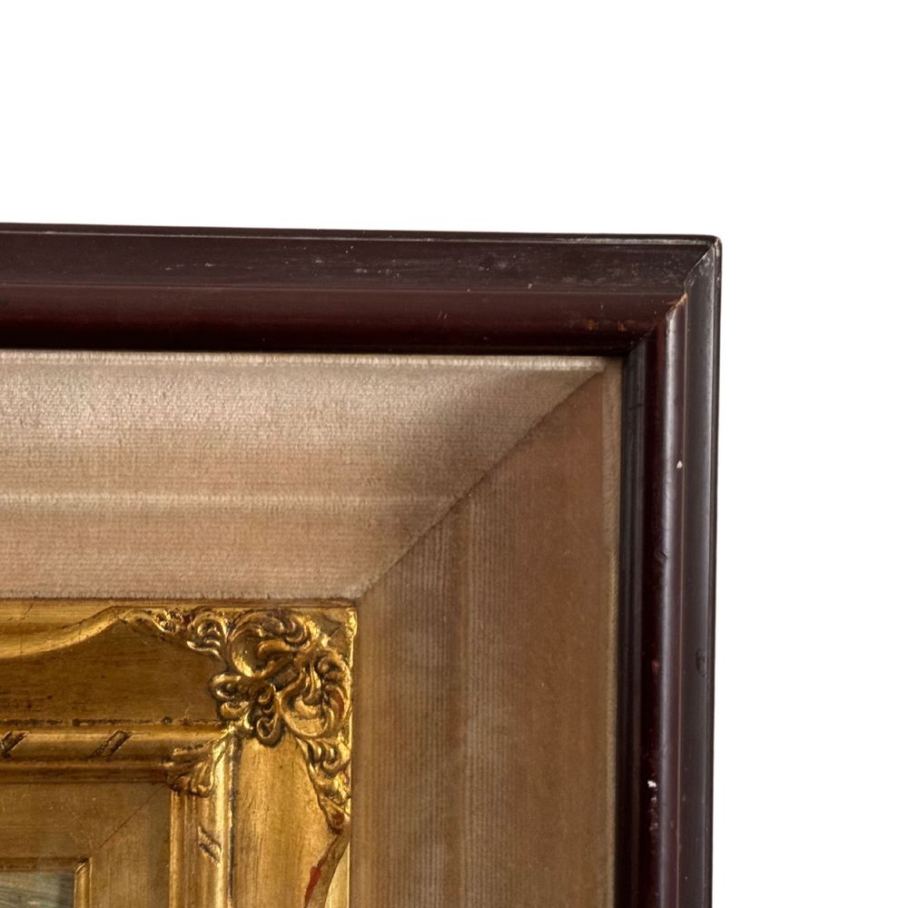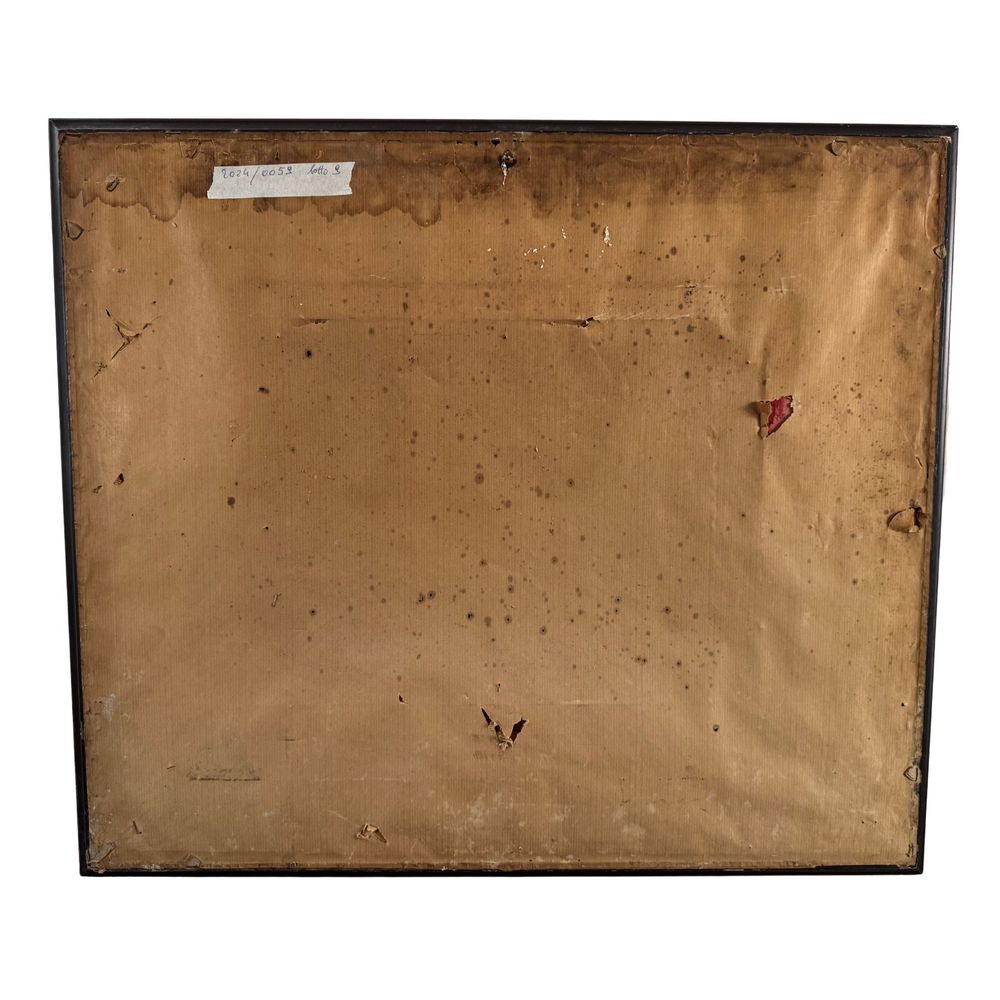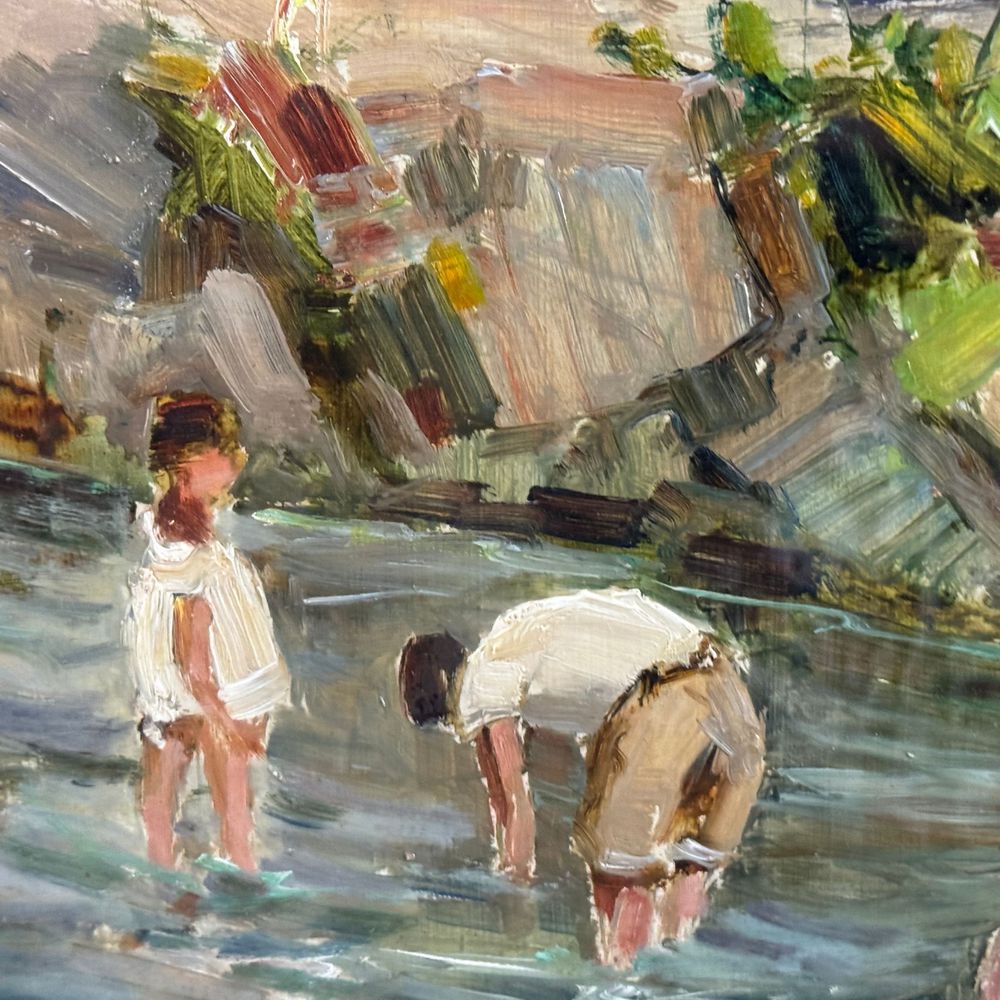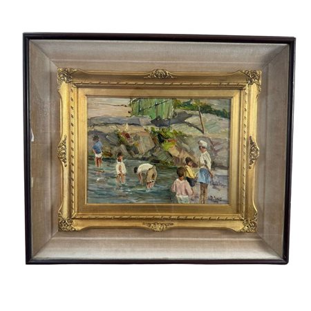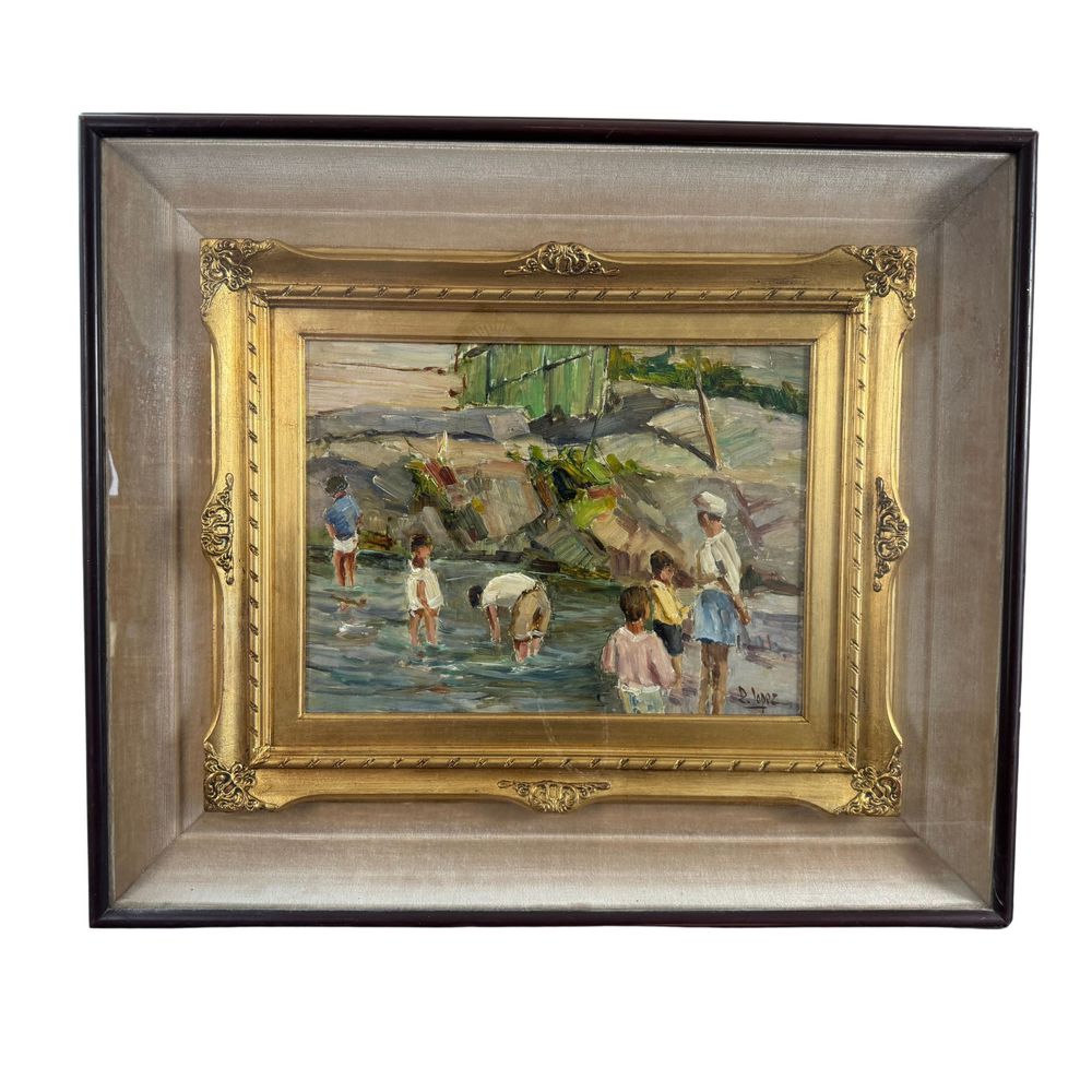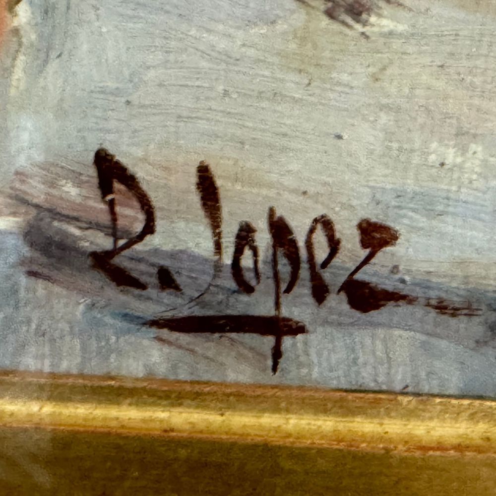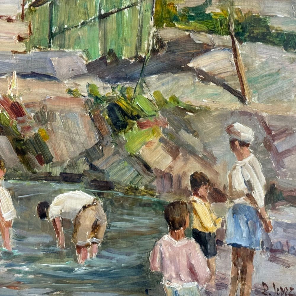 Dipinto olio su pannello, periodo XX secolo scuola Italiana, raffigurante Paesaggio con personaggi. Dimensioni interno cornice: 30x40 cm. Reca firma in basso a destra da Lopez.