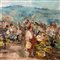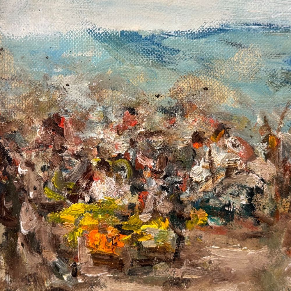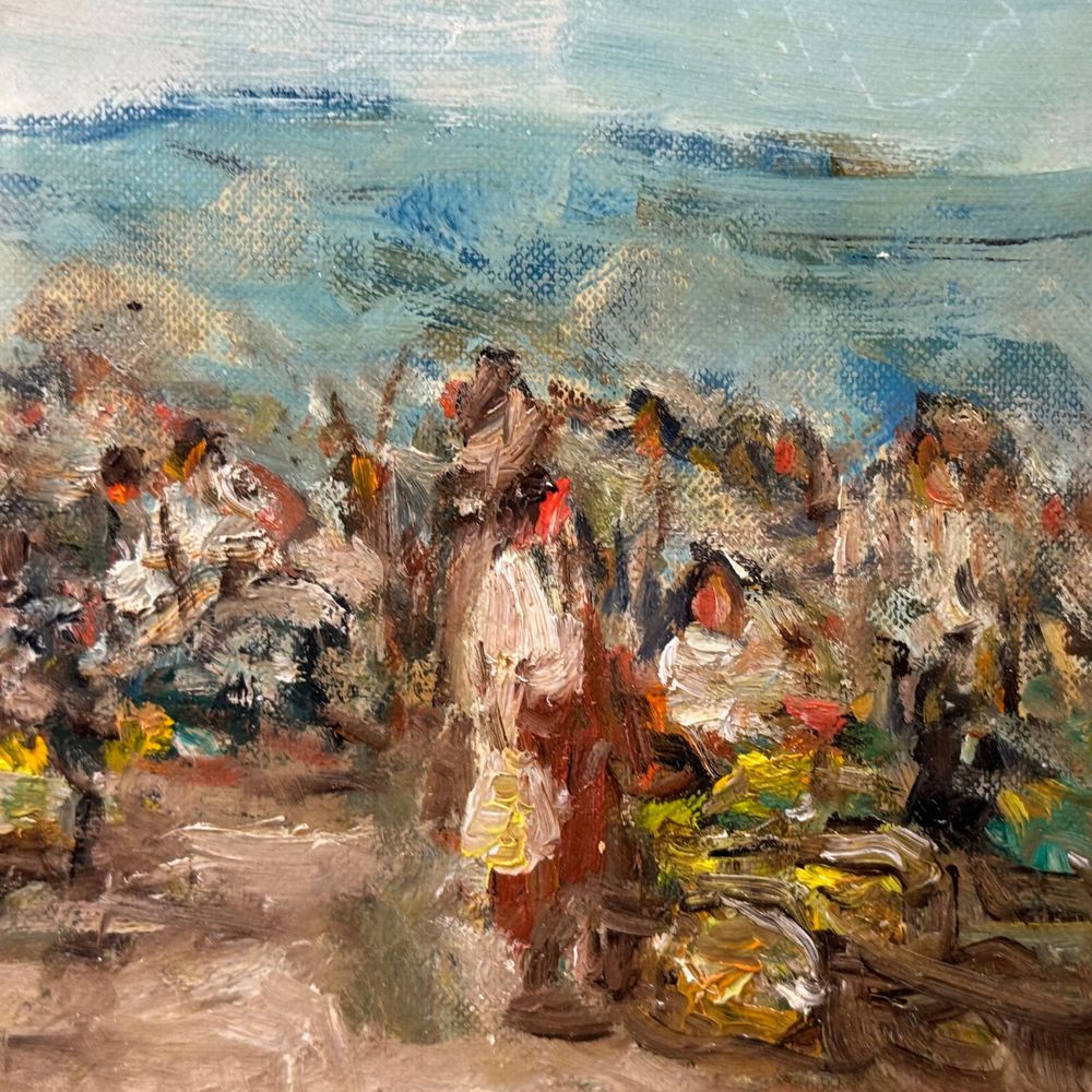 Dipinto olio su tavola, periodo XX secolo scuola Italiana, raffigurante Scena di mercatino.