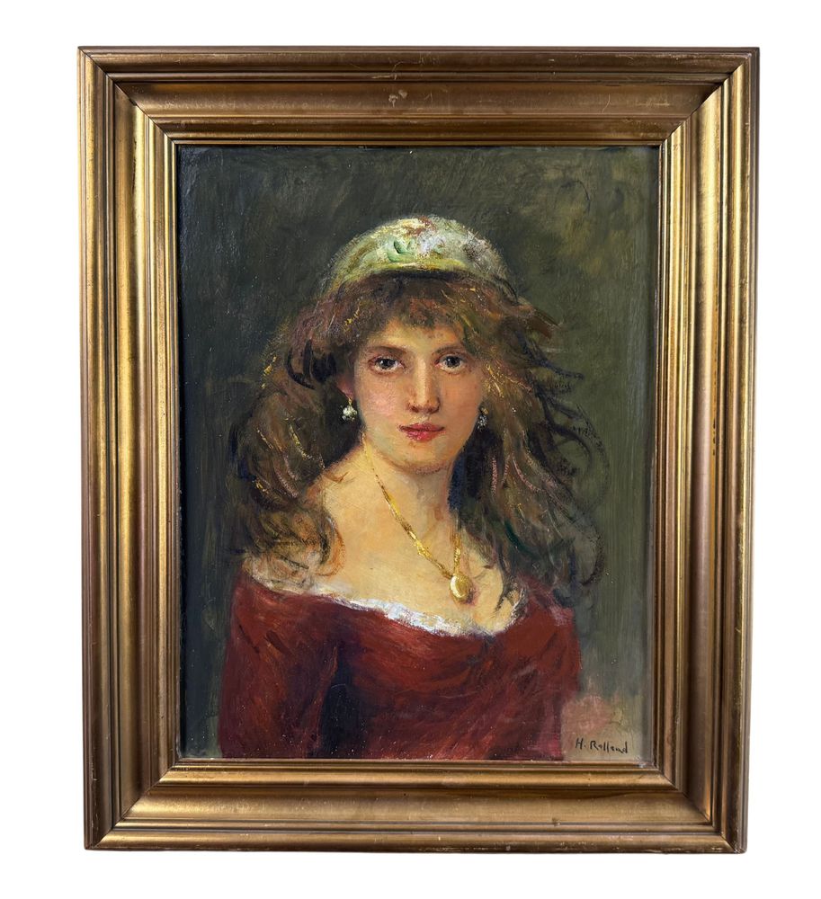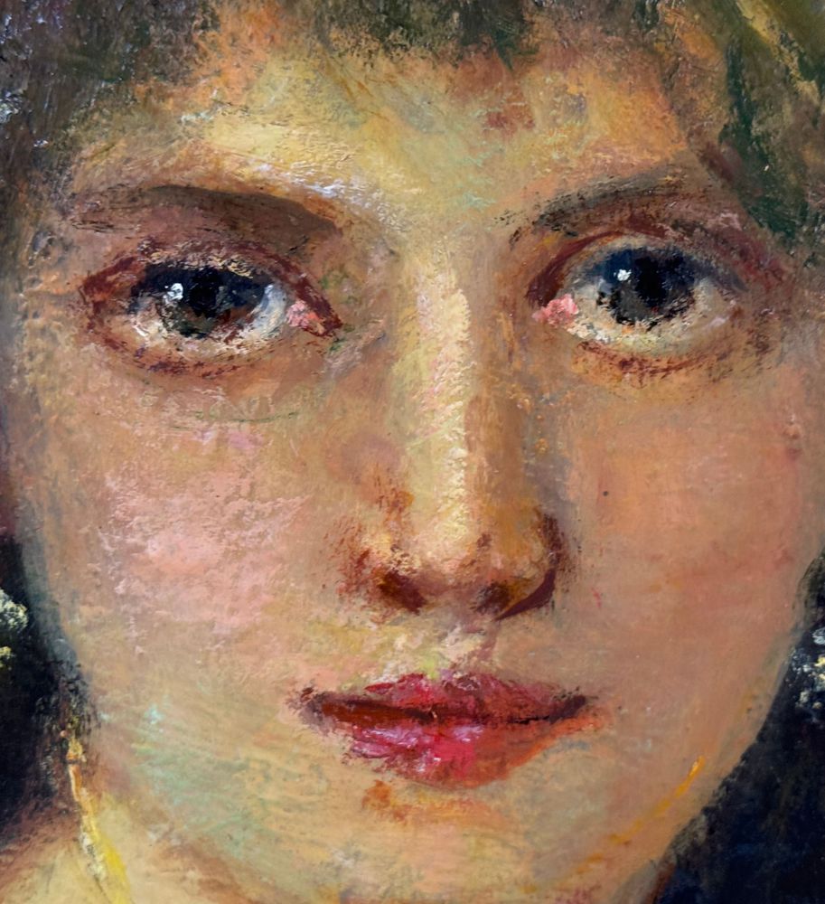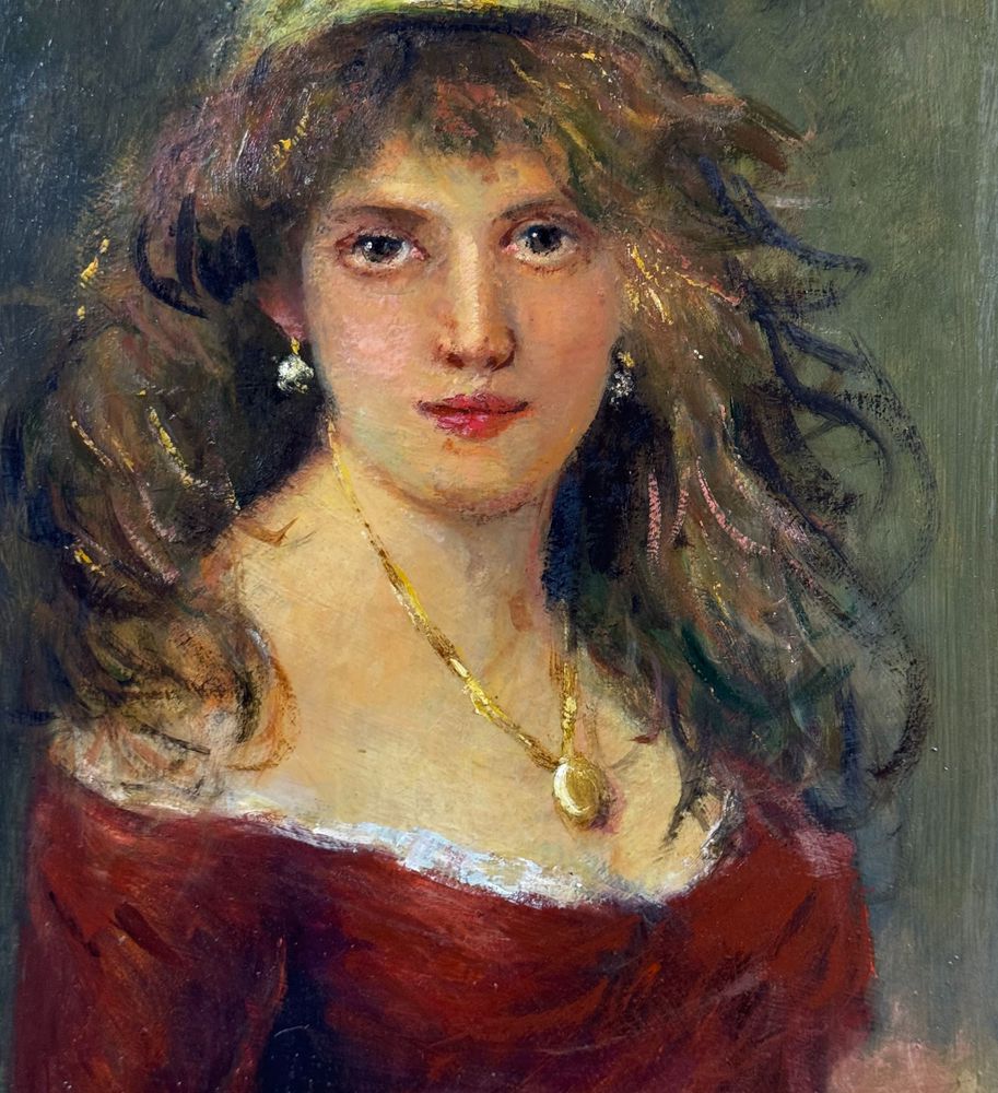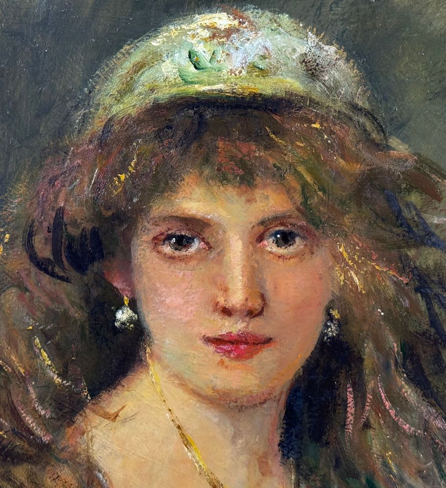 Dipinto olio su pannello, periodo prima metà del XX secolo scuola Europea, raffigurante Ritratto di donna di area orientale. Dimensioni compreso cornice: 50x60 cm. Dimensioni interno cornice: 36x46 cm. Reca firma in basso a destra da artista non identificato. Opera in buone condizioni.