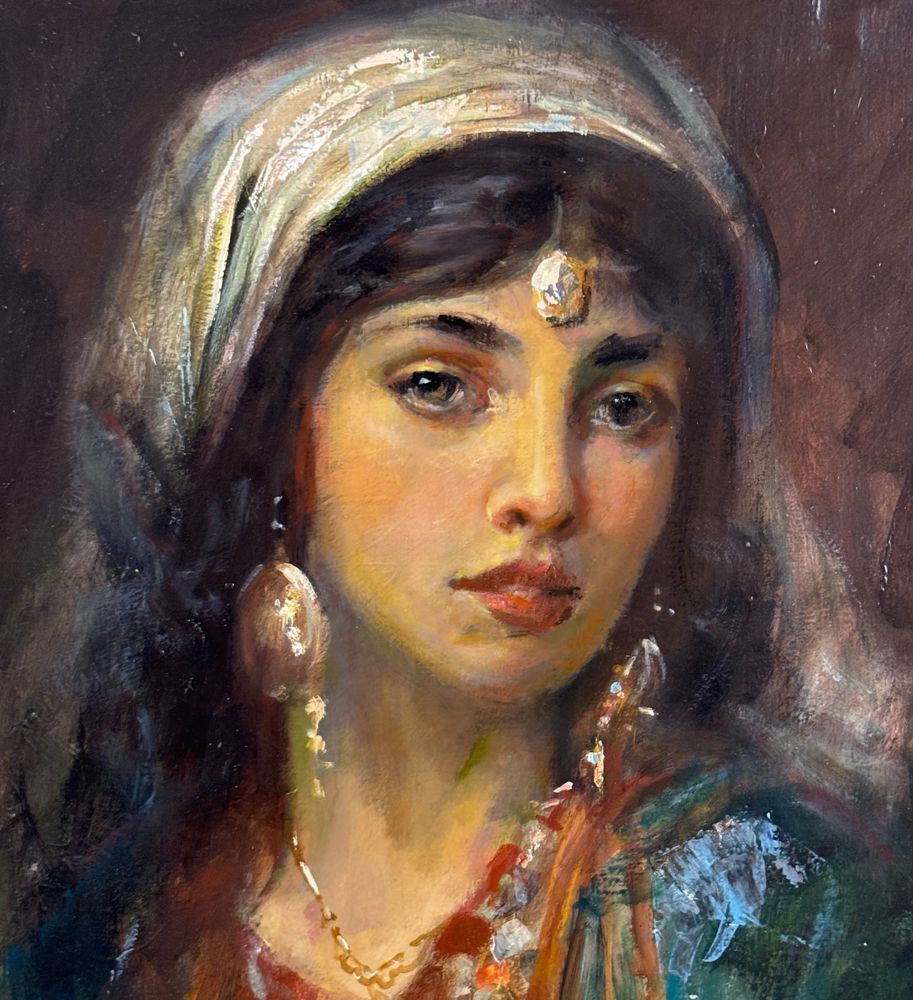 Dipinto olio su tela, periodo XX secolo scuola italiana, raffigurante Ritratto di donna da pittore orientalista. Dimensioni compreso cornice: 60x70 cm. Dimensioni interno cornice: 40x50 cm. Da artista anonimo. Opera in buone condizioni.