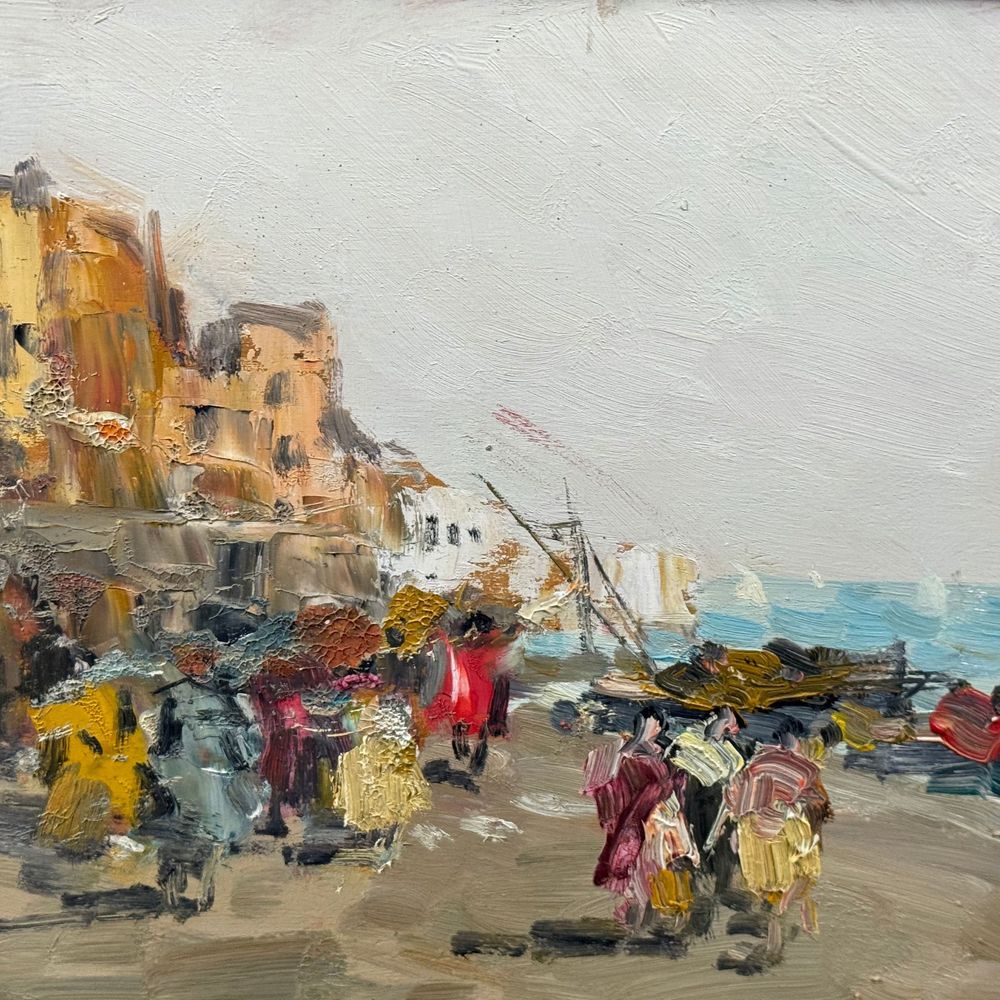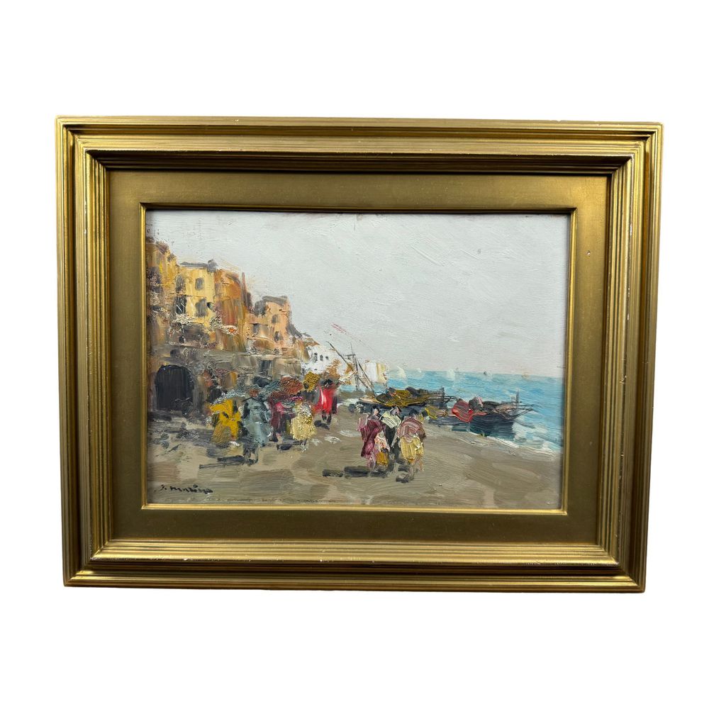 Dipinto olio su tavola, periodo XX secolo, scuola italiana, raffigurante Personaggi in riva al mare. Dimensioni interne cornice: 35x25 cm. Dimensioni esterne cornice: 49x39 cm. Firmato in basso a sinistra da Di Marino. Il pezzo è in buone condizioni.