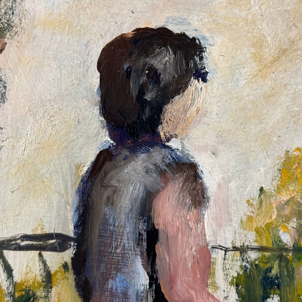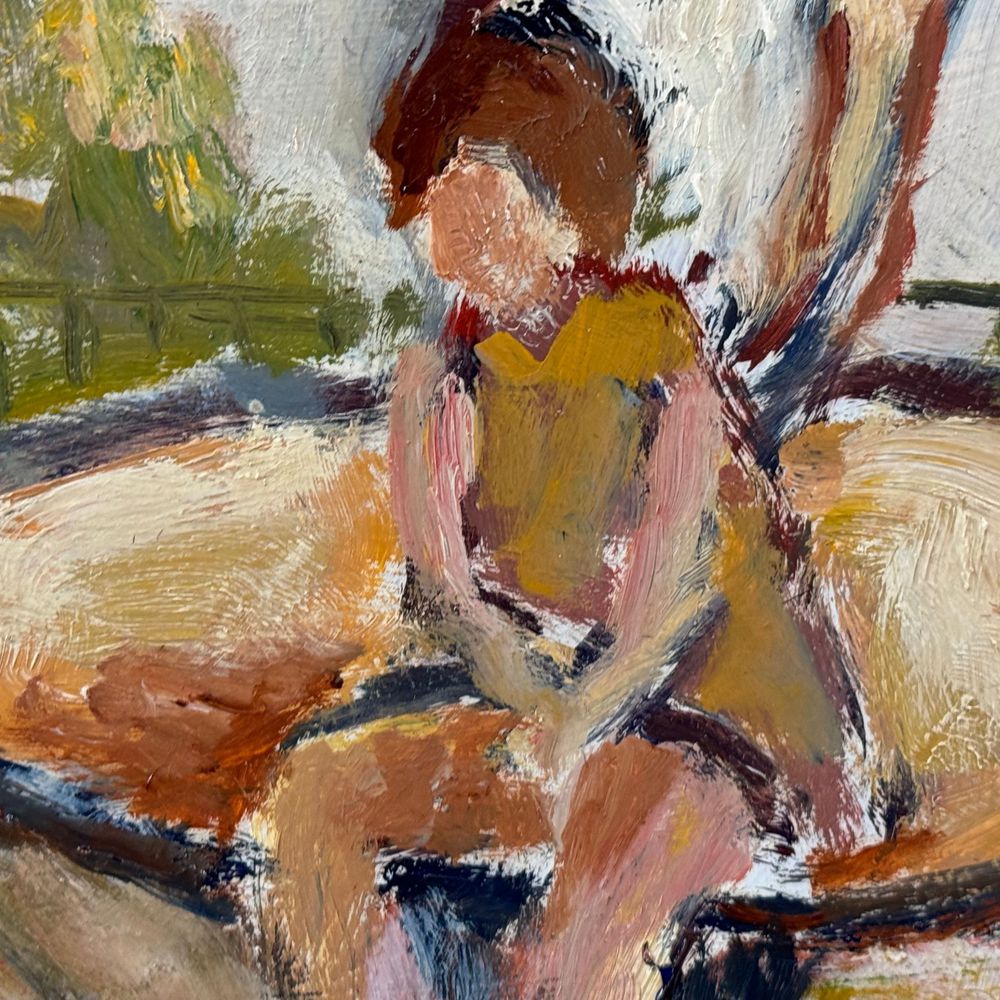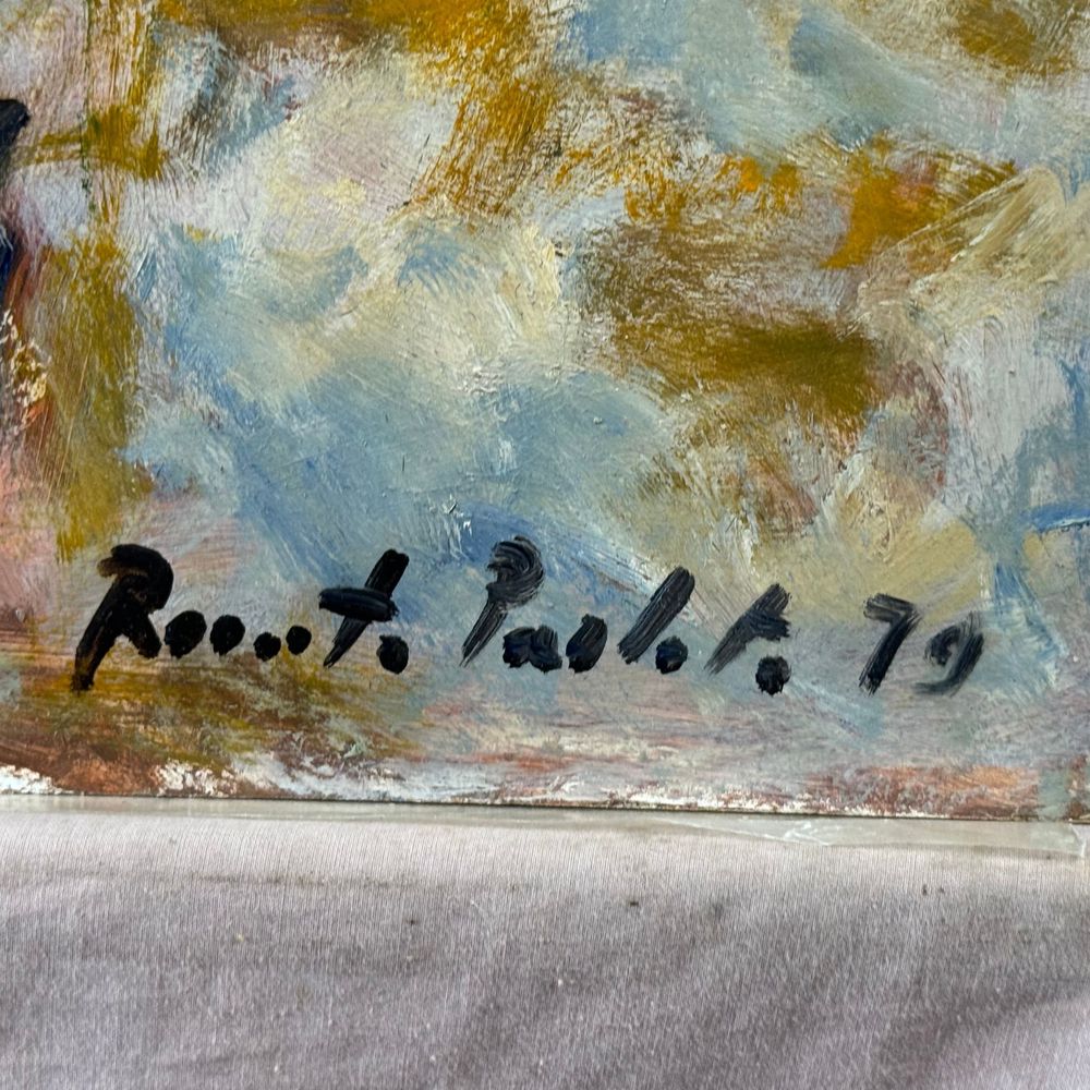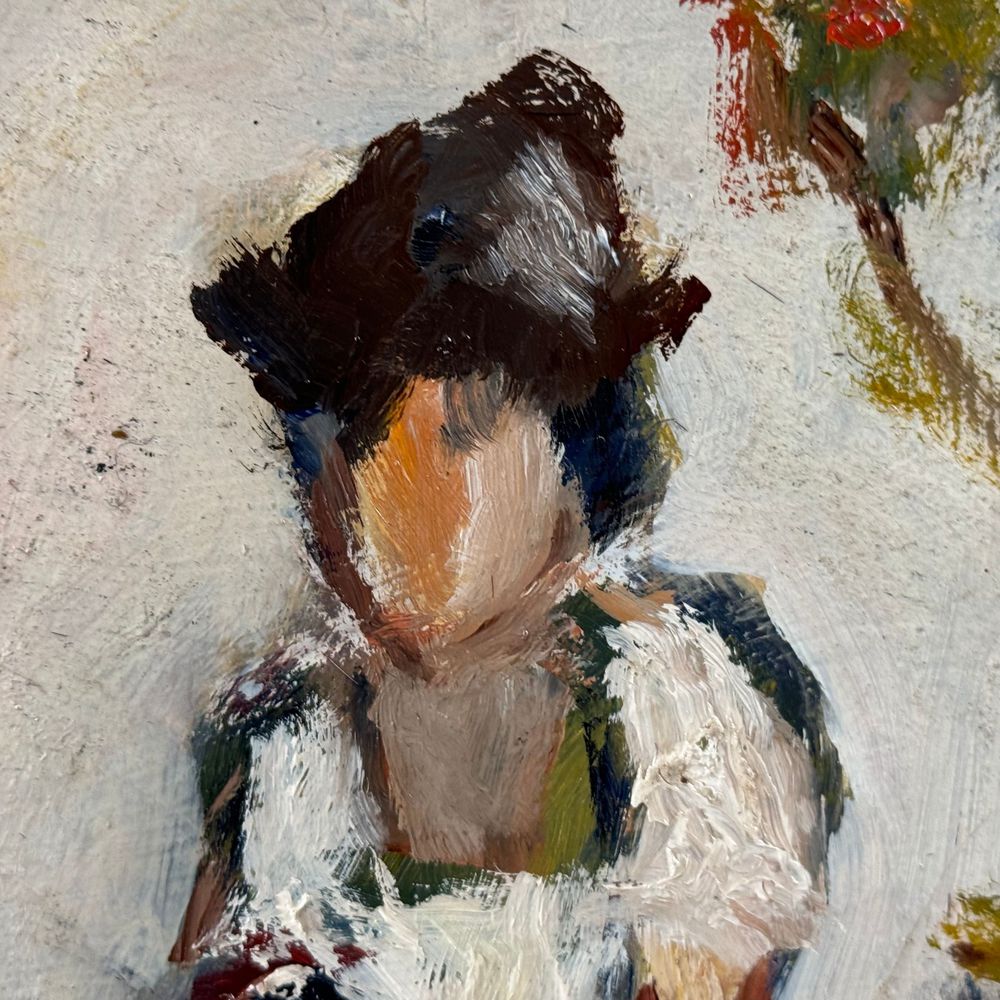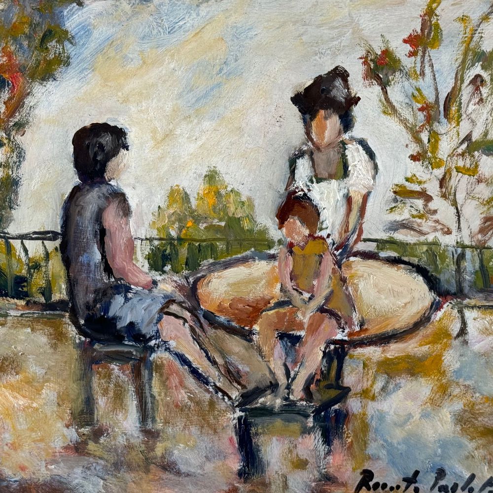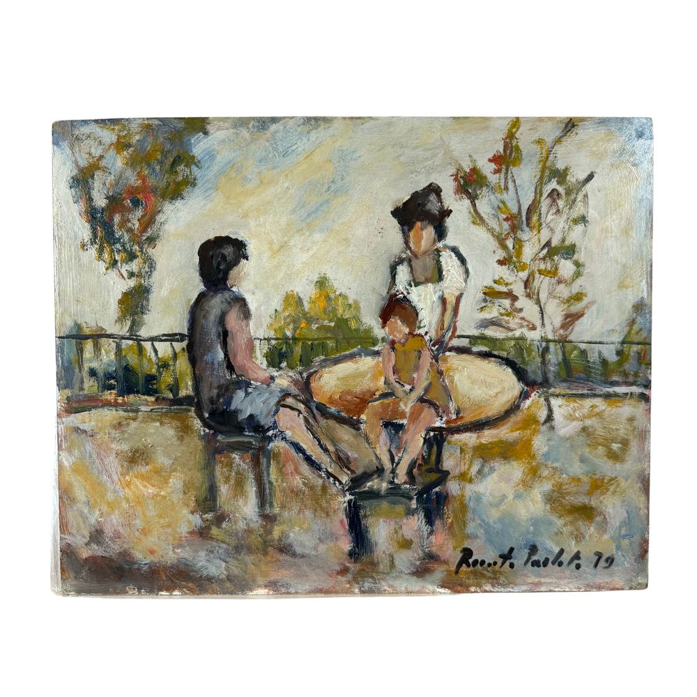 Dipinto olio su pannello, periodo XX secolo scuola Italiana, raffigurante Personaggi in giardino. Dimensioni. 50x40 cm. Firma in basso a destra da Renato Parlato. Opera in buone condizioni.