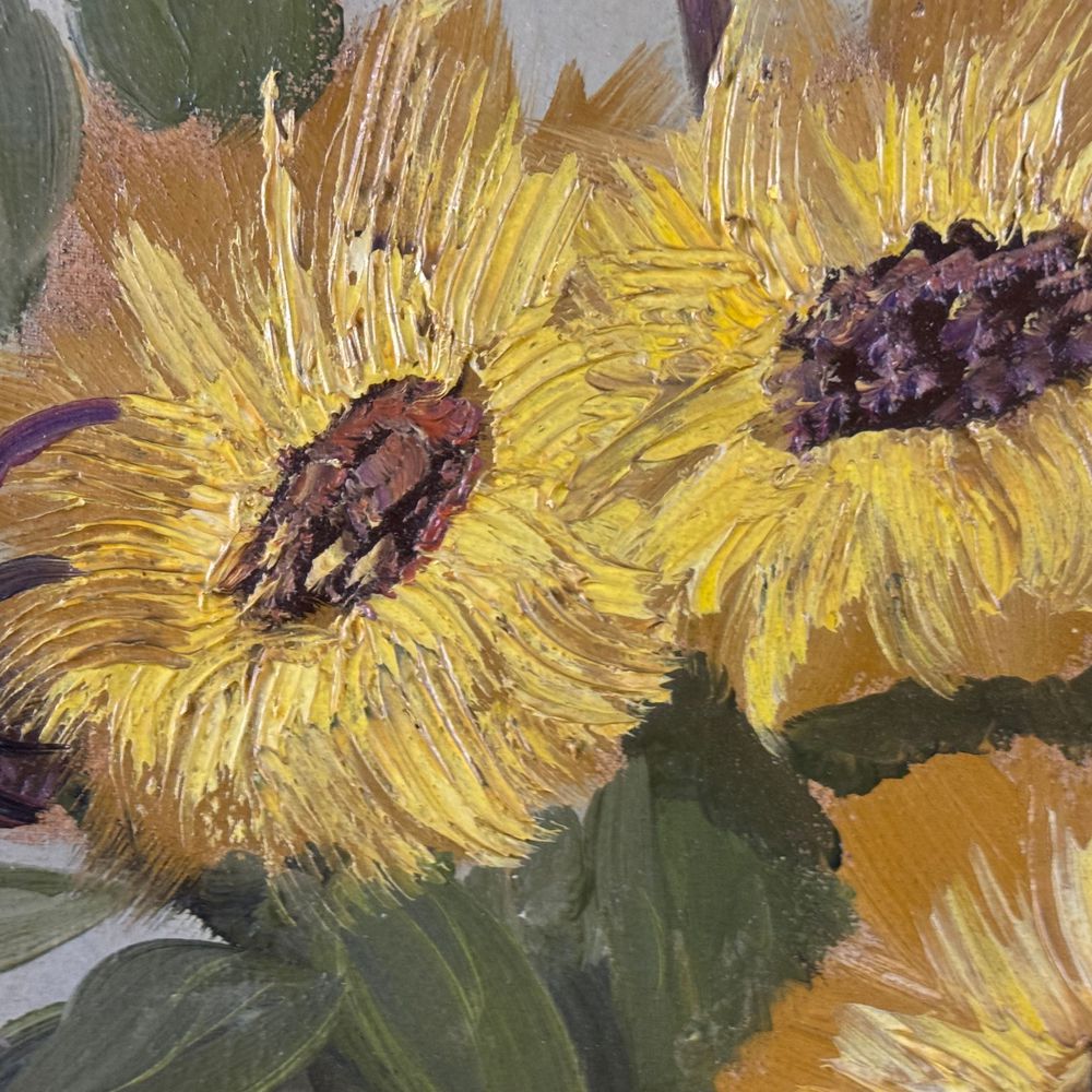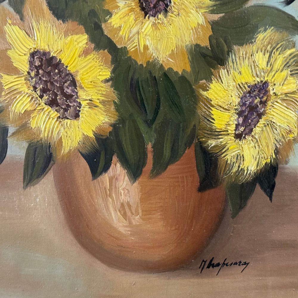 Dipinto olio su tela, periodo XX secolo scuola Italiana, raffigurante Girasoli. Dimensioni interno cornice: 50x60 cm. Dimensioni compreso cornice: 55x65 cm. Reca firma in basso a destra da artista non identificato. Opera in buone condizioni.