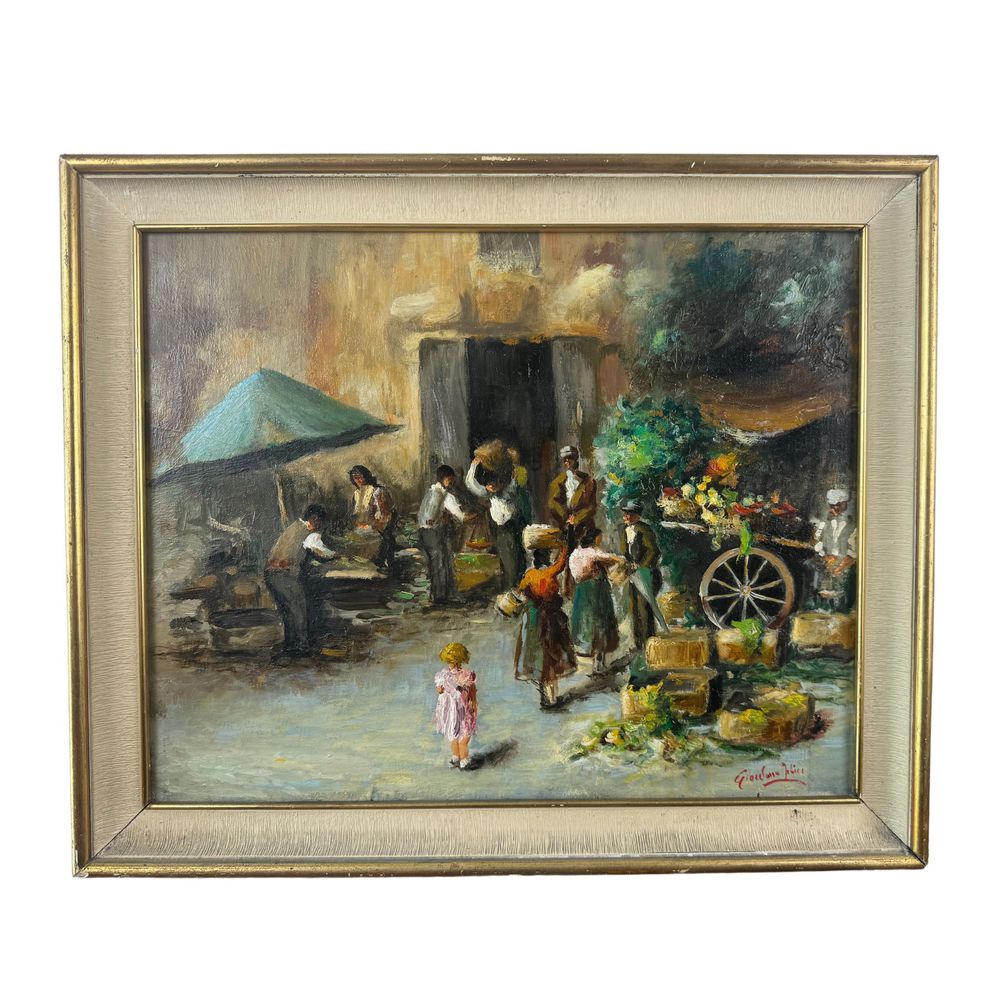 Dipinto olio su tela, periodo XX secolo scuola Italiana, raffigurante Venditori ambulanti. Dimensioni interno cornice: 50x40 cm. Dimensioni compreso cornice: 59x49 cm. Reca firma in basso a destra da Felice Giordano (1880 - 1964). Opera in buone condizioni.