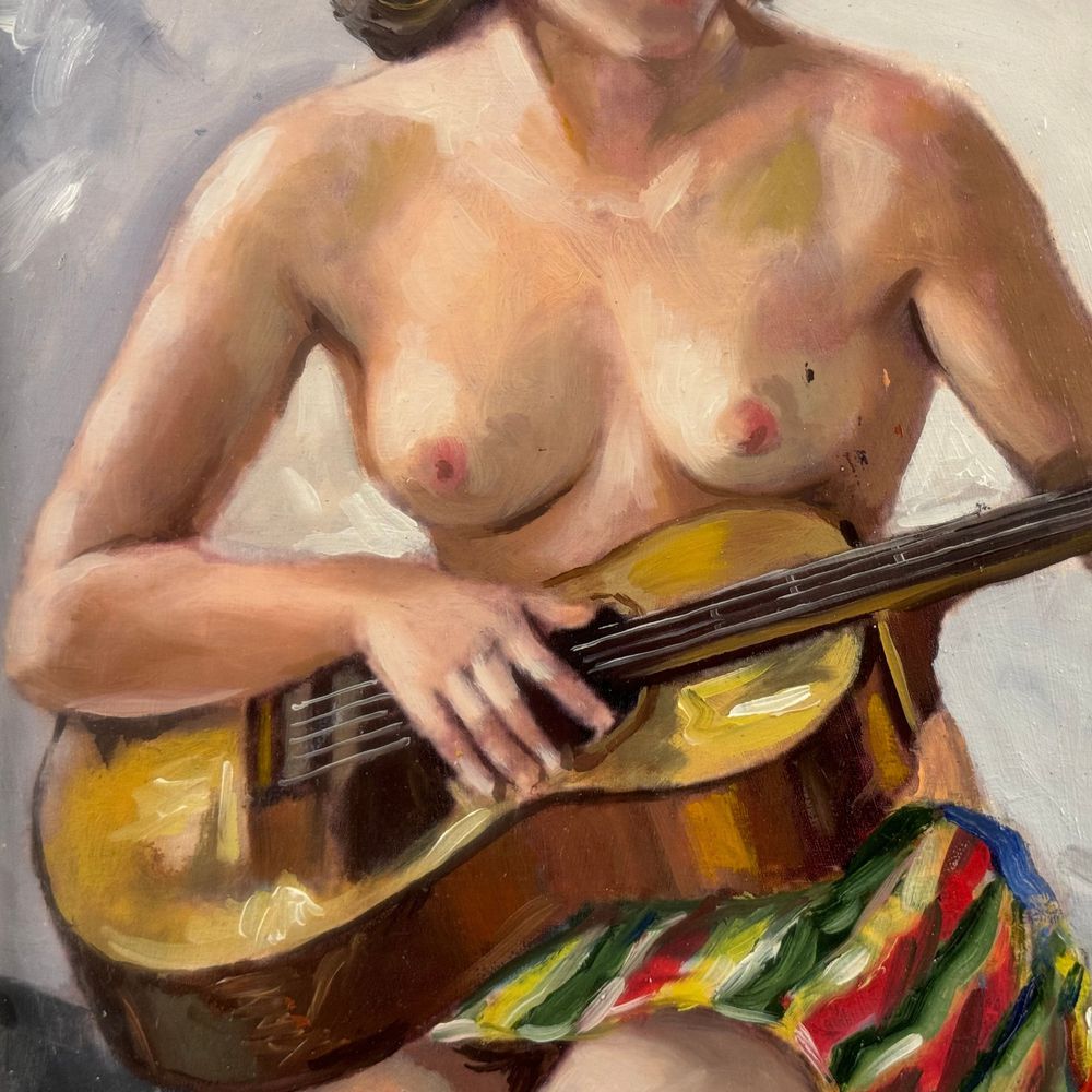 Dipinto olio su tavola, periodo XX secolo scuola Italiana, raffigurante Nudo di donna con chitarra. Dimensioni interno cornice: 40x48 cm. Dimensioni compreso cornice: 54x61. Reca firma in basso a destra da artista non identificato. Opera in buone condizioni.