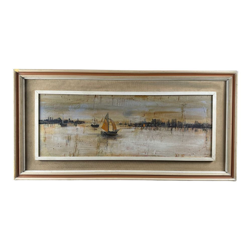 Dipinto olio su pannello, periodo XX secolo scuola Italiana, raffigurante Paesaggio portuale. Dimensioni interno cornice: 30x78 cm. Dimensioni compreso cornice: 49x98 cm. Da artista anonimo. Opera in buone condizioni.