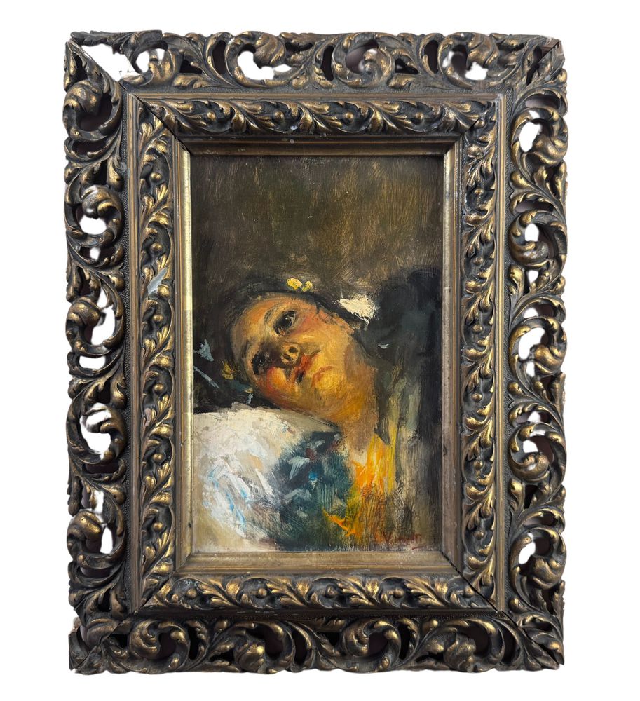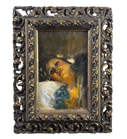 Bozzetto artistico, periodo primi anni del XX secolo, scuola Napoletana, raffigurante Ritratto di giovane donna. Dimensioni compreso cornice: 35x45 cm. Dimensioni interno cornice: 18x28 cm. Reca firma in basso a destra V. Irolli. Opera in buone condizioni.